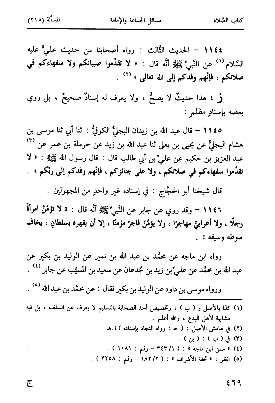 1144 - الحديث الثَّالث: رواه أصحابنا من حديث عليٍّ عليه السَّلام (1) عن النَّبيِّ صَلَّى اللَّهُ عَلَيْهِ وَسَلَّمَ أنَّه قال: " لا تقدِّموا صبيانكم ولا سفهاءكم في صلاتكم، فإنَّهم وفدكم إلى الله تعالى " (2).