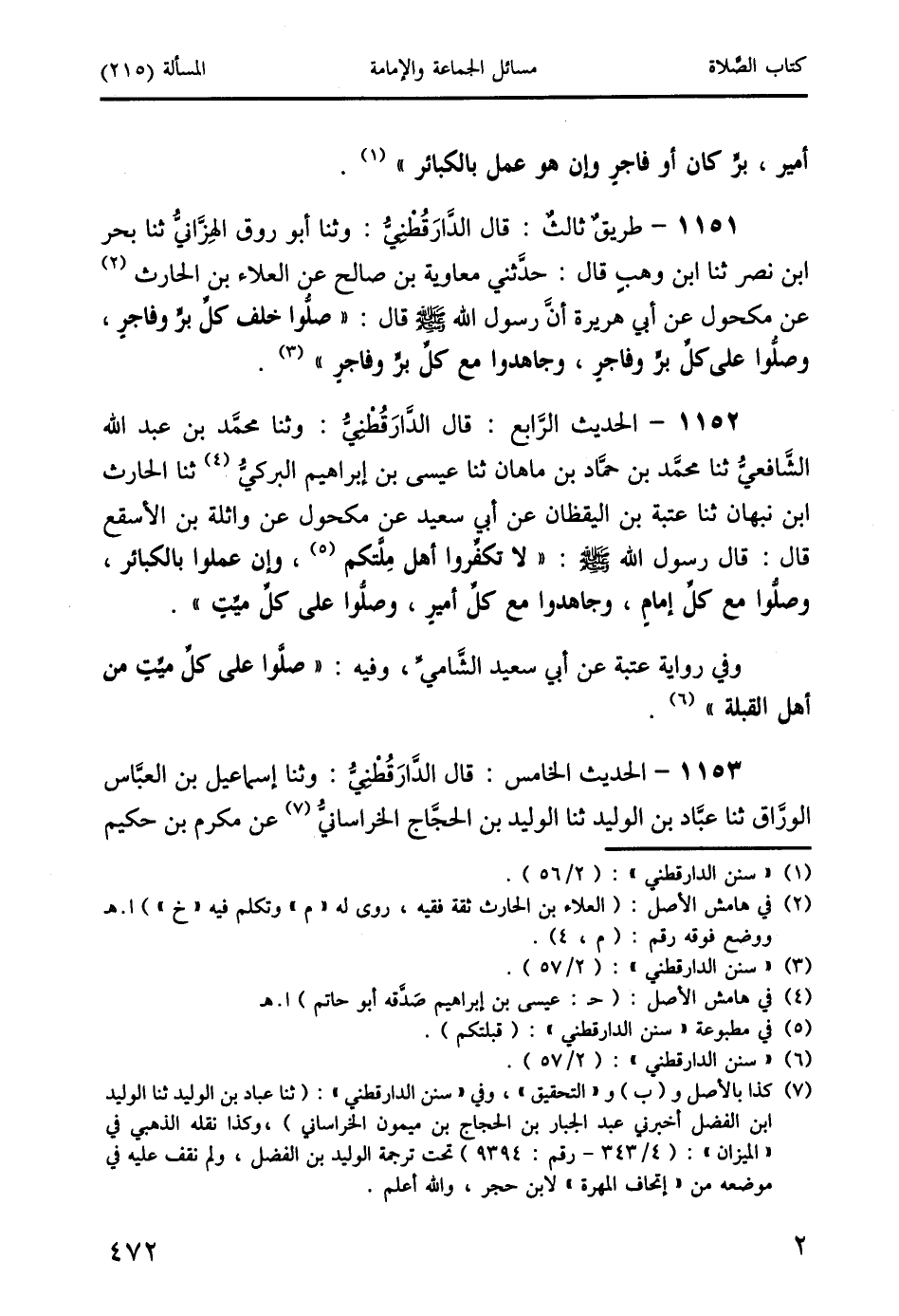1151 - طريقٌ ثالثٌ: قال الدَّارَقُطْنِيُّ: وثنا أبو روق الهِزَّانيُّ ثنا بحر ابن نصر ثنا ابن وهبٍ قال: حدَّثني معاوية بن صالح عن العلاء بن الحارث (2) عن مكحول عن أبي هريرة أنَّ رسول الله صَلَّى اللَّهُ عَلَيْهِ وَسَلَّمَ قال: " صلُّوا خلف كلِّ برٍّ وفاجرٍ، وصلُّوا على كلِّ برٍّ وفاجرٍ، وجاهدوا مع كلِّ برٍّ وفاجرٍ " (3).