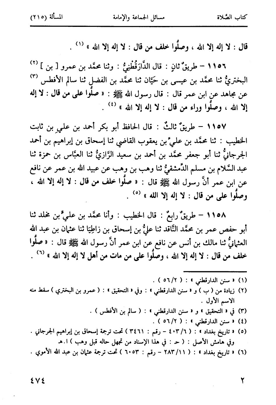 1158 - طريقٌ رابعٌ: قال الخطيب: وأنا محمد بن عليٍّ بن مخلد ثنا أبو حفص عمر بن محمد النَّاقد ثنا عليُّ بن إسحاق بن زاطِيَا ثنا عثمان بن عبد الله العثمانيُّ ثنا مالك بن أنس عن نافع عن ابن عمر أنَّ رسول الله صَلَّى اللَّهُ عَلَيْهِ وَسَلَّمَ قال: " صلُّوا خلف من قال: لا إله إلا الله، وصلُّوا على من مات من أهل لا إله إلا الله " (6).