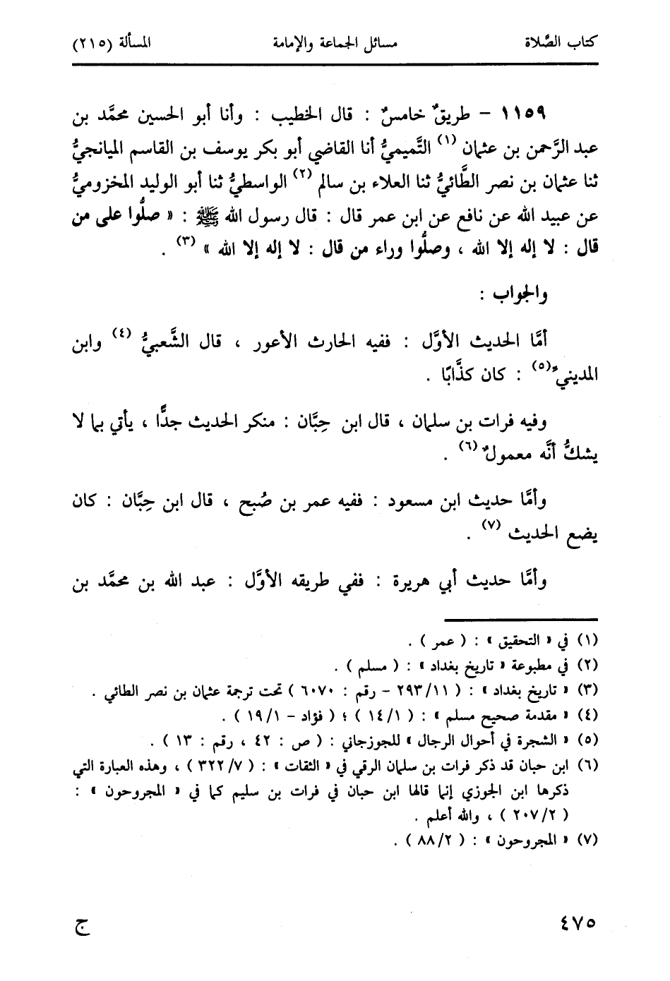 1159 - طريقٌ خامسٌ: قال الخطيب: وأنا أبو الحسين محمد بن عبد الرَّحمن بن عثمان (1) التَّميميُّ أنا القاضي أبو بكر يوسف بن القاسم الميانجيُّ ثنا عثمان بن نصر الطَّائيُّ ثنا العلاء بن سالم (2) الواسطيُّ ثنا أبو الوليد المخزوميُّ عن عبيد الله عن نافع عن ابن عمر قال: قال رسول الله صَلَّى اللَّهُ عَلَيْهِ وَسَلَّمَ: " صلُّوا على من قال: لا إله إلا الله، وصلُّوا وراء من قال: لا إله إلا الله " (3).