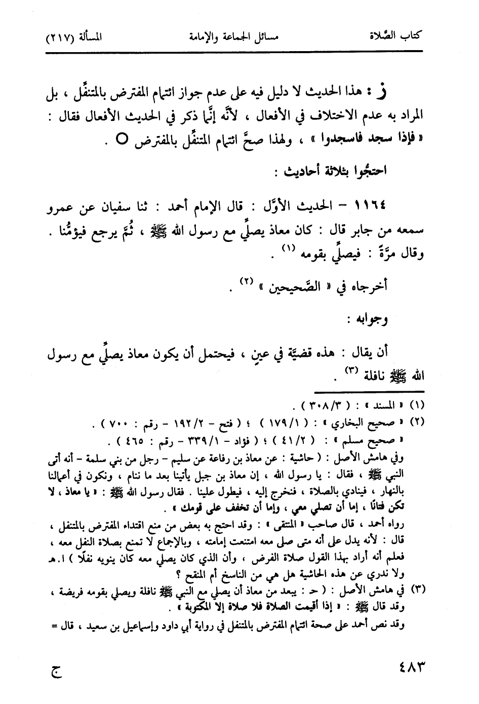 (3) في هامش الأصل: (حـ: يبعد من معاذ أن يصلي مع النبي صَلَّى اللَّهُ عَلَيْهِ وَسَلَّمَ نافلة ويصلي بقومه فريضة، وقد قال صَلَّى اللَّهُ عَلَيْهِ وَسَلَّمَ: " إذا أقيمت الصلاة فلا صلاة إلا المكتوبة ".