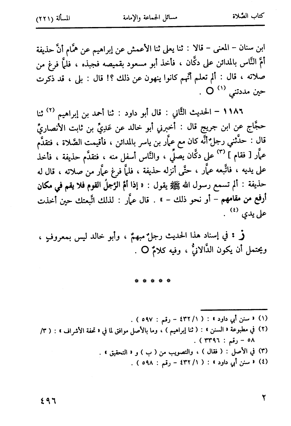 1186 - الحديث الثَّاني: قال أبو داود: ثنا أحمد بن إبراهيم (2) ثنا حجَّاج عن ابن جريج قال: أخبرني أبو خالد عن عَدِيِّ بن ثابت الأنصاريِّ قال: حدَّثني رجلٌ أنَّه كان مع عمَّار بن ياسر بالمدائن، فأقيمت الصَّلاة، فتقدَّم عمَّار [فقام] (3) على دكَّان يصلِّي، والنَّاس أسفل منه، فتقدَّم حذيفة، فأخذ على يديه، فاتَّبعه عمَّار، حتى أنزله حذيفة، فلمَّا فرغ عمَّار من صلاته، قال له حذيفة: ألم تسمع رسول الله صَلَّى اللَّهُ عَلَيْهِ وَسَلَّمَ يقول: " إذا أمَّ الرَّجلُ القوم قلا يقم في مكان أرفع من مقامهم - أو نحو ذلك - ". قال عمَّار: لذلك اتَّبعتك حين أخذت على يدي (4).