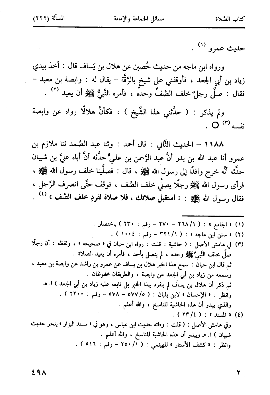 1188 - الحديث الثَّاني: قال أحمد: وثنا عبد الصَّمد ثنا ملازم بن عمرو أنا عبد الله بن بدر أنَّ عبد الرَّحمن بن عليٍّ حدَّثه أنَّ أباه عليَّ بن شيبان حدَّثه أَنَّه خرج وافدًا إلى رسول الله صَلَّى اللَّهُ عَلَيْهِ وَسَلَّمَ، قال: فصلَّينا خلف رسول الله صَلَّى اللَّهُ عَلَيْهِ وَسَلَّمَ، فرأى رسول الله صَلَّى اللَّهُ عَلَيْهِ وَسَلَّمَ رجلاً يصلِّي خلف الصَّفِّ، فوقف حتى انصرف الرَّجل، فقال رسول الله صَلَّى اللَّهُ عَلَيْهِ وَسَلَّمَ: " استقبل صلاتك، فلا صلاة لفردٍ خلف الصَّفِّ " (4).