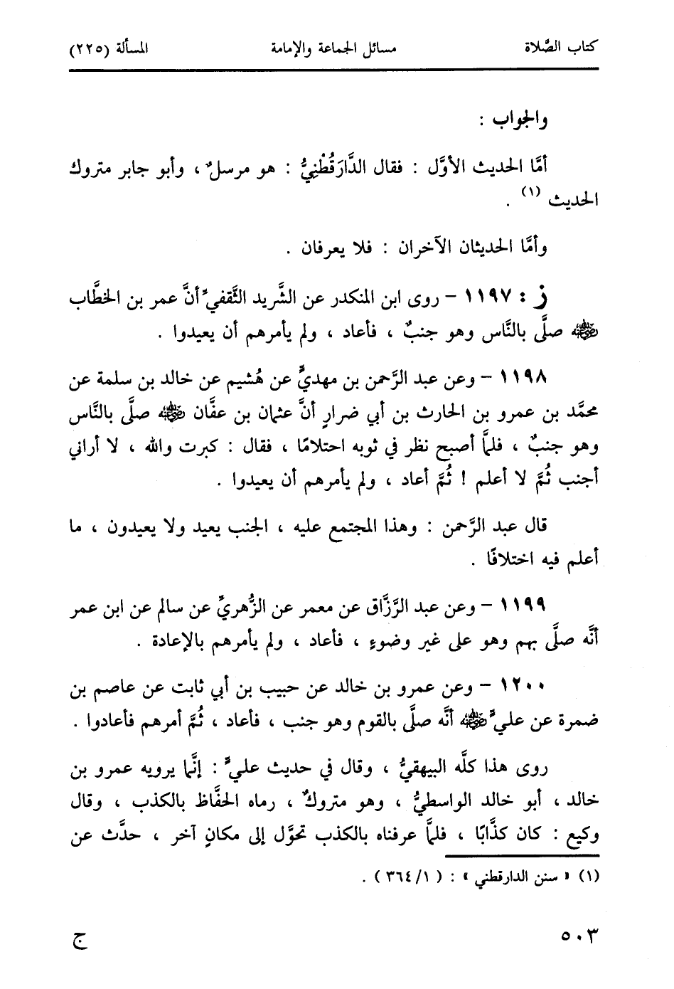 ز: 1197 - روى ابن المنكدر عن الشَّريد الثَّقفيِّ أنَّ عمر بن الخطَّاب رضي الله عنه صلَّى بالنَّاس وهو جنبٌ، فأعاد، ولم يأمرهم أن يعيدوا.