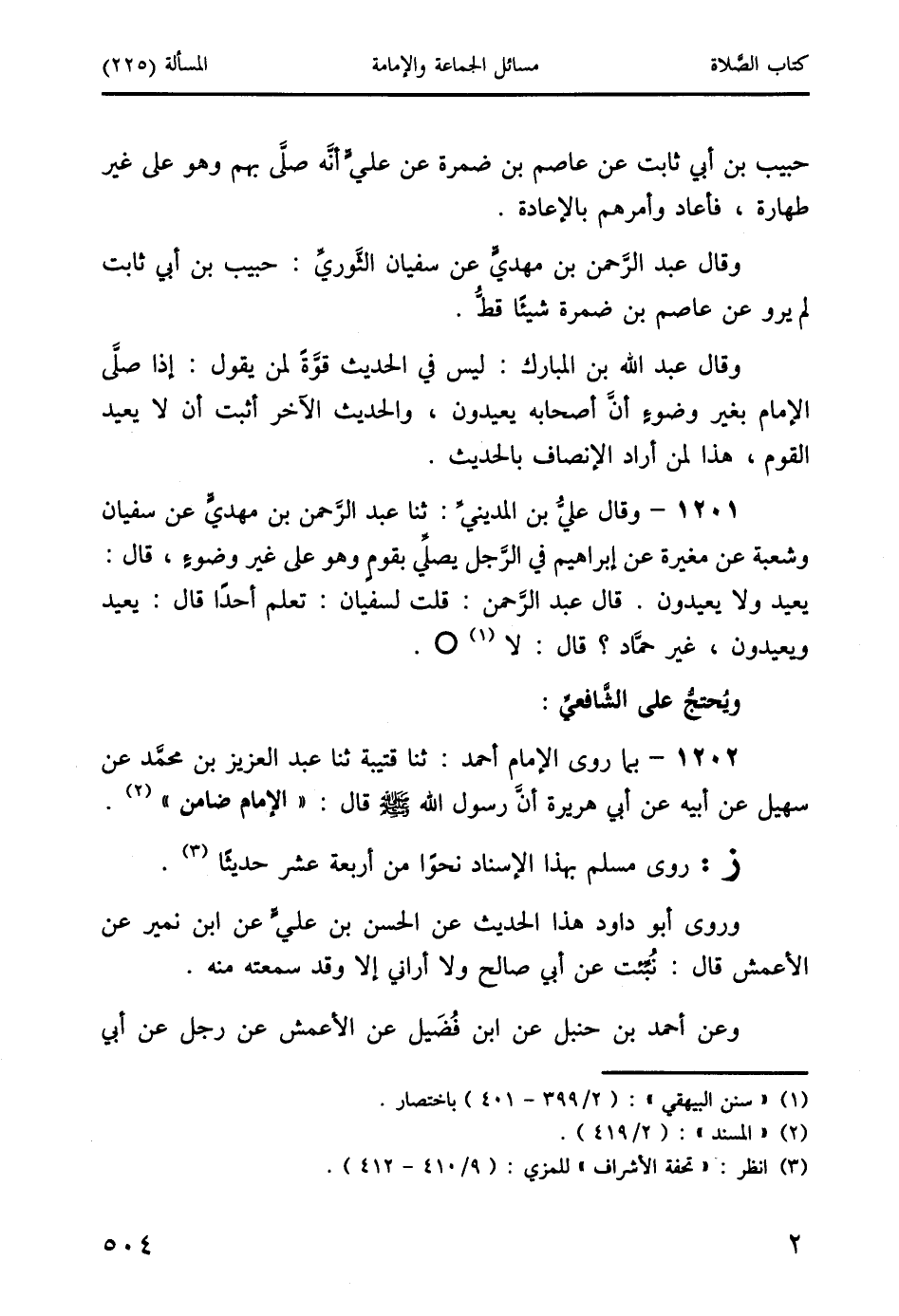 1201 - وقال عليُّ بن المدينيِّ: ثنا عبد الرَّحمن بن مهديٍّ عن سفيان وشعبة عن مغيرة عن إبراهيم في الرَّجل يصلِّي بقومٍ وهو على غير وضوءٍ، قال: يعيد ولا يعيدون. قال عبد الرَّحمن: قلت لسفيان: تعلم أحدًا قال: يعيد ويعيدون، غير حمَّاد؟ قال: لا (1) O.