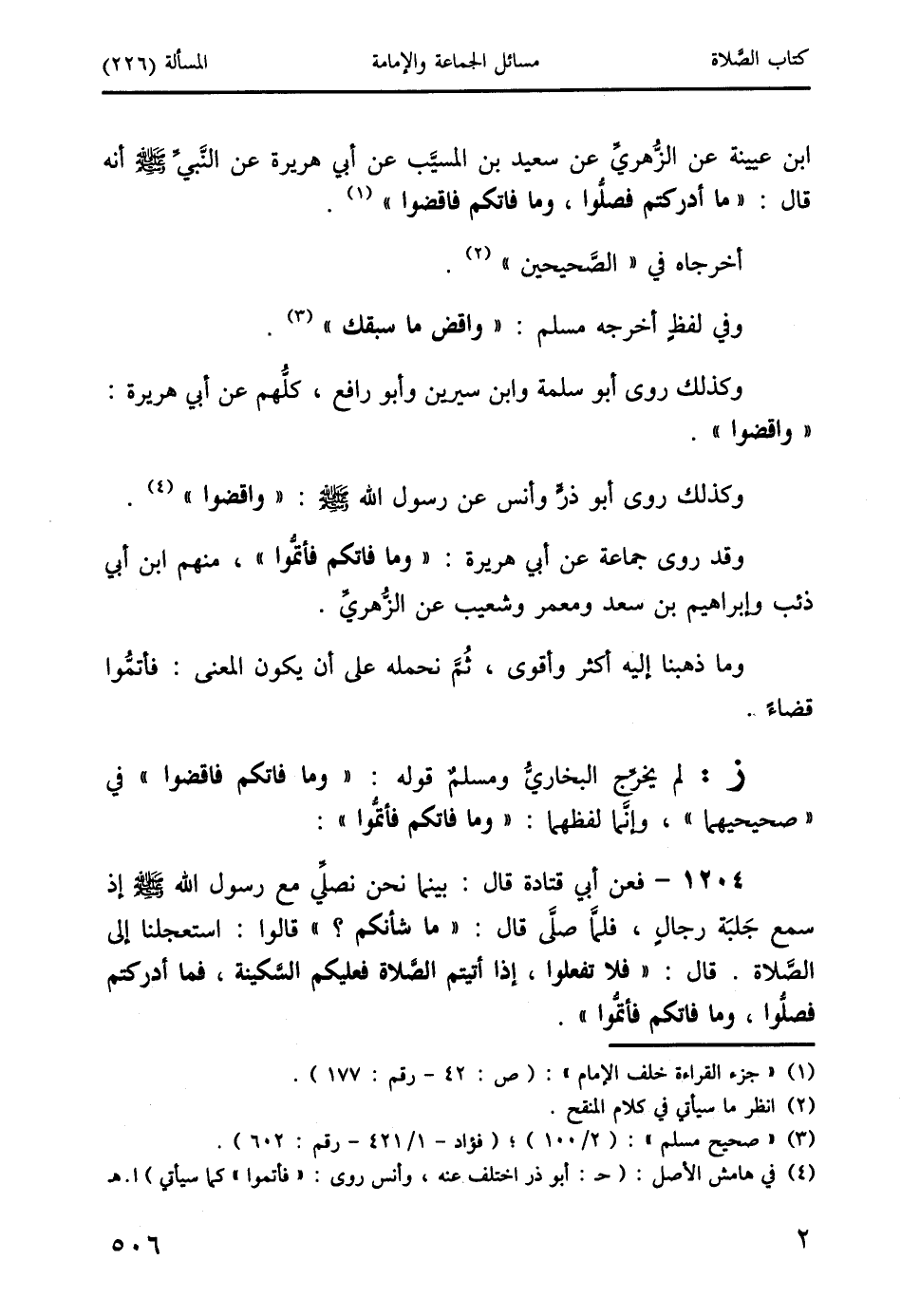 ابن عيينة عن الزُّهريِّ عن سعيد بن المسيّب عن أبي هريرة عن النَّبيِّ صَلَّى اللَّهُ عَلَيْهِ وَسَلَّمَ أنه قال: " ما أدركتم فصلُّوا، وما فاتكم فاقضوا " (1).