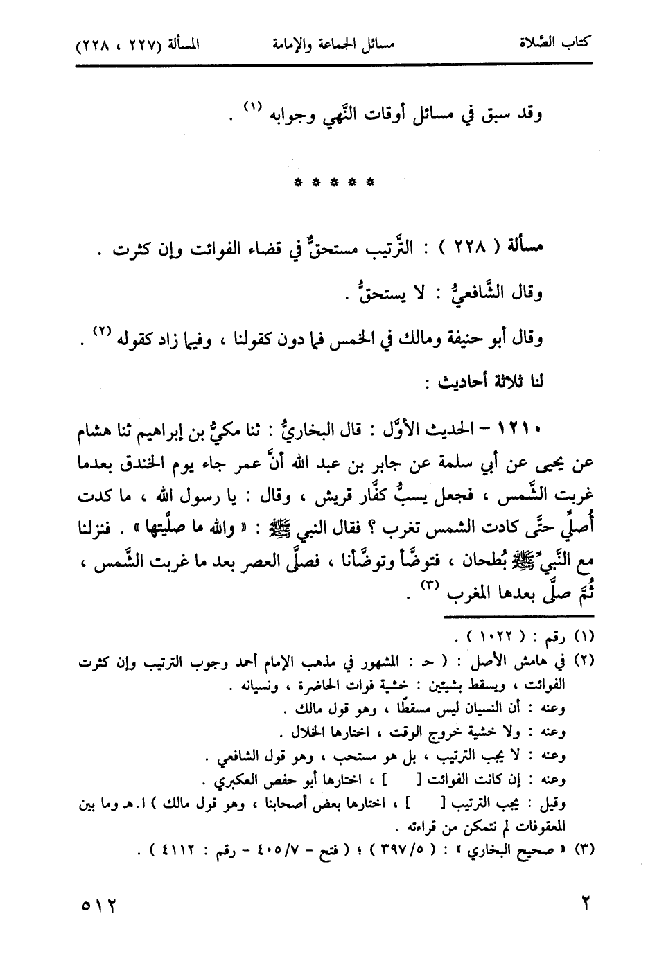 (2) في هامش الأصل: (حـ: المشهور في مذهب الإمام أحمد وجوب الترتيب وإن كثرت الفوائت، ويسقط بشيئين: خشية فوات الحاضرة، ونسيانه.