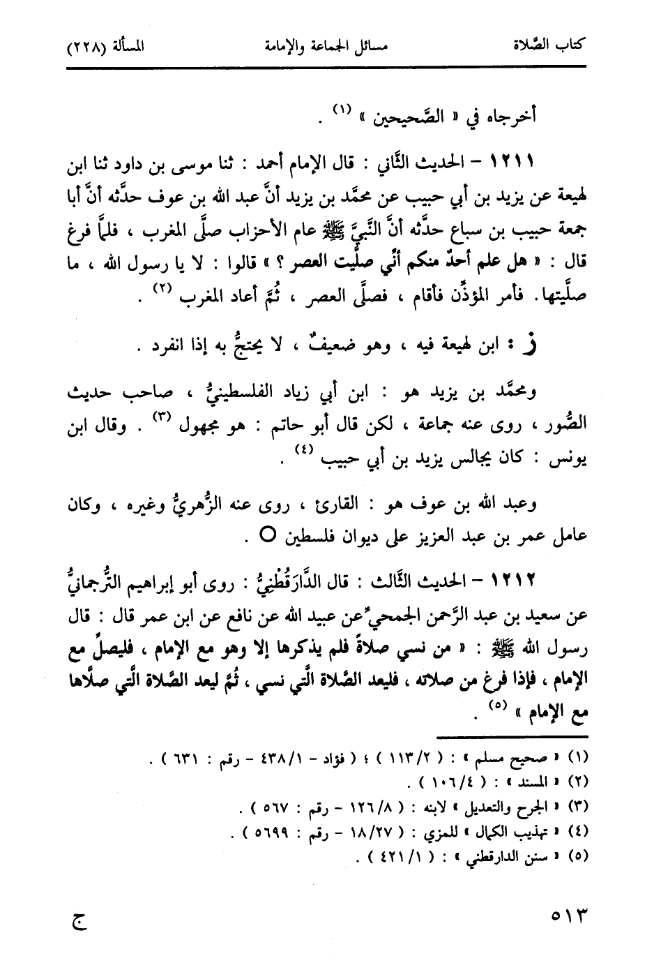 1211 - الحديث الثَّاني: قال الإمام أحمد: ثنا موسى بن داود ثنا ابن لهيعة عن يزيد بن أبي حبيب عن محمد بن يزيد أنَّ عبد الله بن عوف حدَّثه أنَّ أبا جمعة حبيب بن سباع حدَّثه أنَّ النَّبيَّ صَلَّى اللَّهُ عَلَيْهِ وَسَلَّمَ عام الأحزاب صلَّى المغرب، فلمَّا فرغ قال: " هل علم أحدٌ منكم أنِّي صلَّيت العصر؟ " قالوا: لا يا رسول الله، ما صلَّيتها. فأمر المؤذِّن فأقام، فصلَّى العصر، ثُمَّ أعاد المغرب (2).