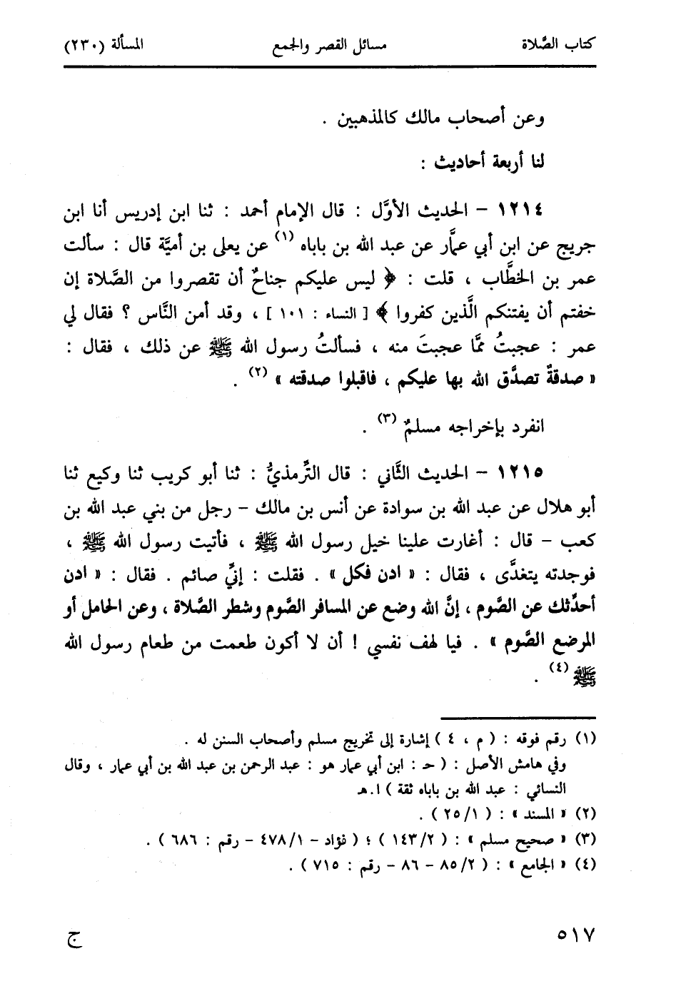 1214 - الحديث الأوَّل: قال الإمام أحمد: ثنا ابن إدريس أنا ابن جريج عن ابن أبي عمَّار عن عبد الله بن باباه (1) عن يعلى بن أميَّة قال: سألت عمر بن الخطَّاب، قلت: {لَيْسَ عَلَيْكُمْ جُنَاحٌ أَن تَقْصُرُوا مِنَ الصَّلَاةِ إِنْ خِفْتُمْ أَن يَفْتِنَكُمُ الَّذِينَ كَفَرُوا} [النساء: 101]، وقد أمن النَّاس؟ فقال لي عمر: عجبتُ ممَّا عجبتَ منه، فسألتُ رسول الله صَلَّى اللَّهُ عَلَيْهِ وَسَلَّمَ عن ذلك، فقال: " صدقةٌ تصدَّق الله بها عليكم، فاقبلوا صدقته " (2).