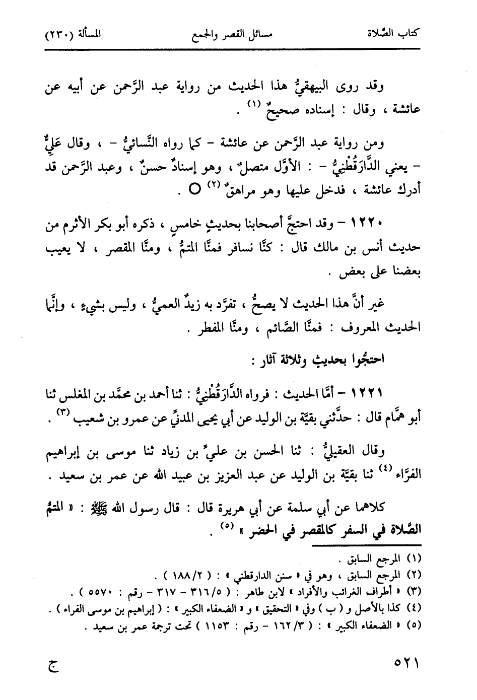 كلاهما عن أبي سلمة عن أبي هريرة قال: قال رسول الله صَلَّى اللَّهُ عَلَيْهِ وَسَلَّمَ: " المتمُّ الصَّلاة في السَّفر كالمقصر في الحضر " (5).