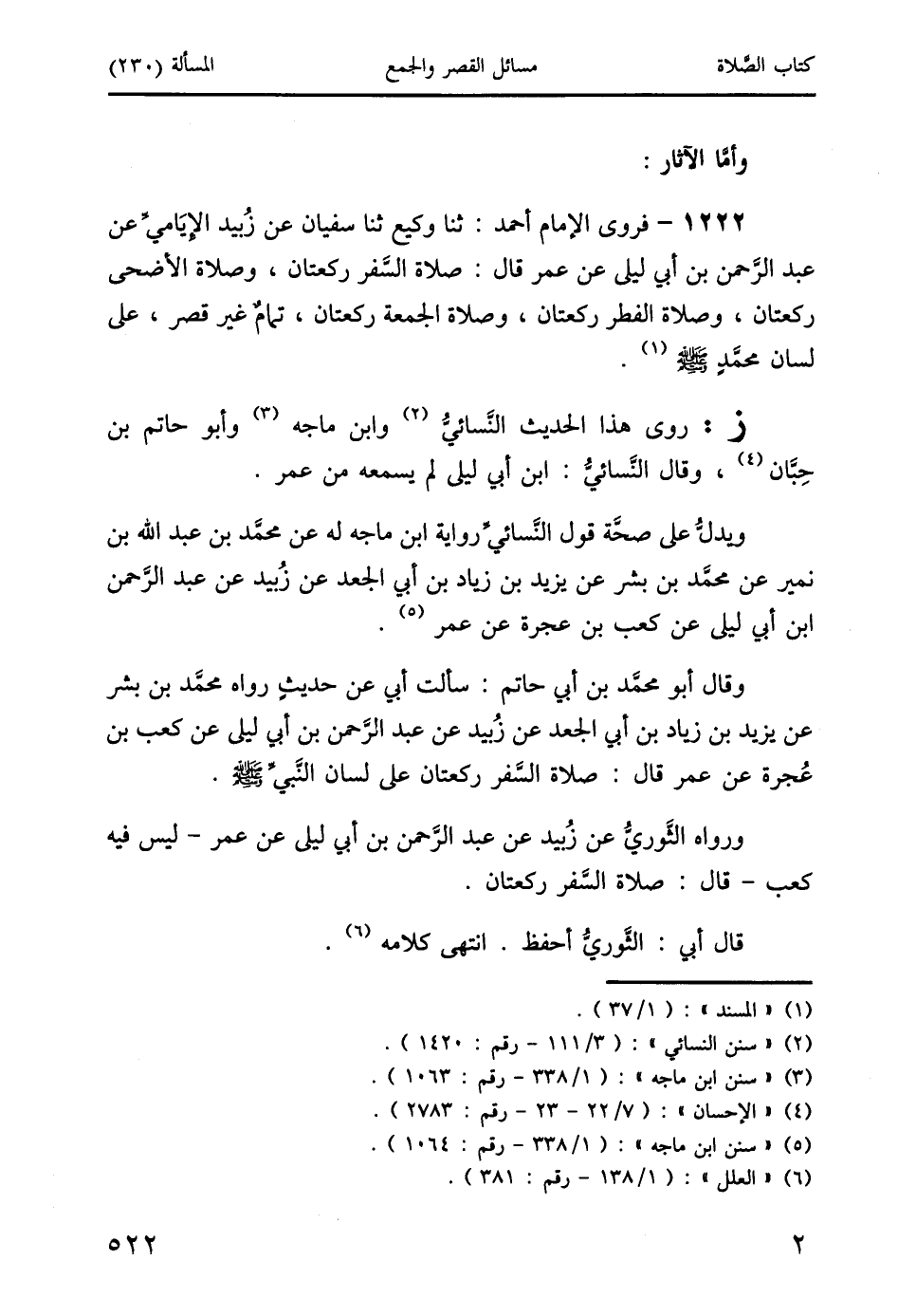 1222 - فروى الإمام أحمد: ثنا وكيع ثنا سفيان عن زُبيد الإيَاميِّ عن عبد الرَّحمن بن أبي ليلى عن عمر قال: صلاة السَّفر ركعتان، وصلاة الأضحى ركعتان، وصلاة الفطر ركعتان، وصلاة الجمعة ركعتان، تمامٌ غير قصر، على لسان محمدٍ صَلَّى اللَّهُ عَلَيْهِ وَسَلَّمَ (1).