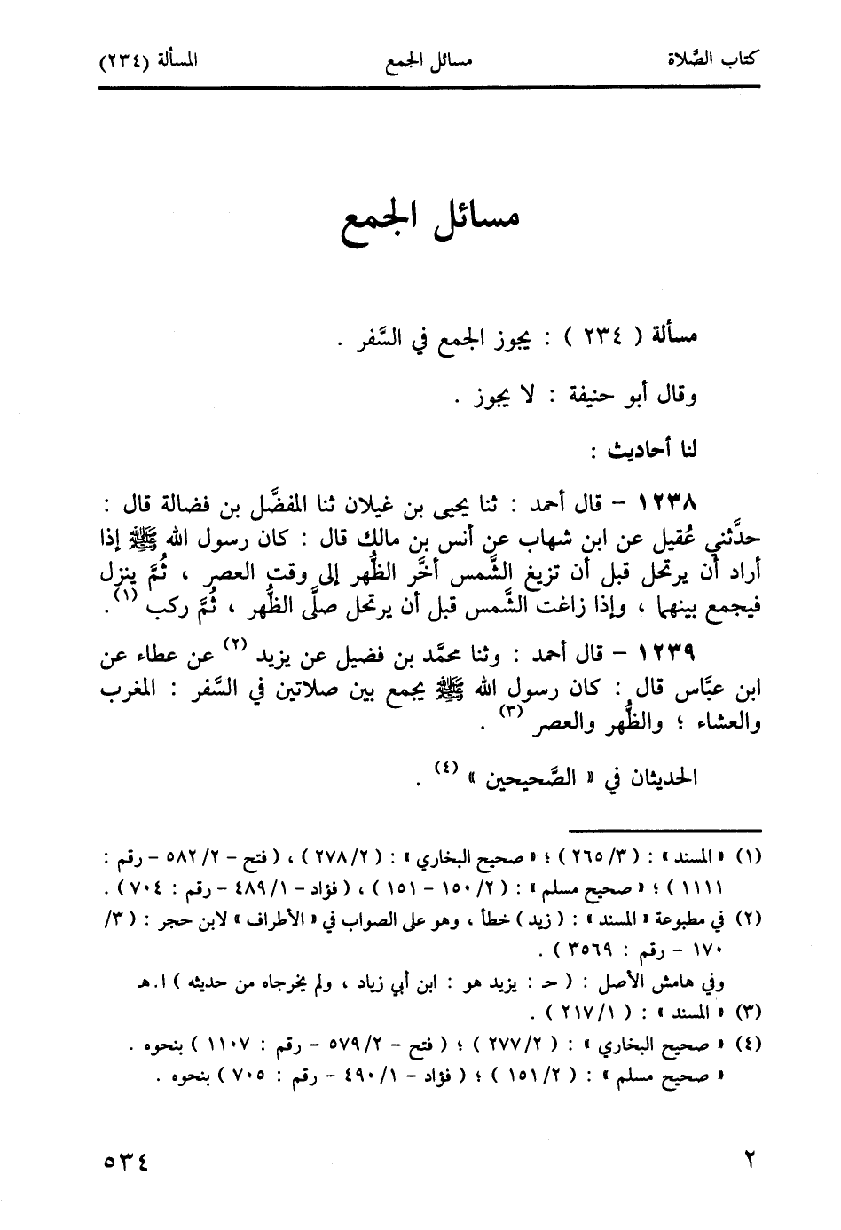 1238 - قال أحمد: ثنا يحيى بن غيلان ثنا المفضَّل بن فضالة قال: حدَّثني عُقيل عن ابن شهاب عن أنس بن مالك قال: كان رسول الله صَلَّى اللَّهُ عَلَيْهِ وَسَلَّمَ إذا أراد ان يرتحل قبل أن تزيغ الشَّمس أخَّر الظُّهر إلى وقت العصر، ثُمَّ ينزل فيجمع بينهما، وإذا زاغت الشَّمس قبل أن يرتحل صلَّى الظُّهر، ثُمَّ ركب (1).