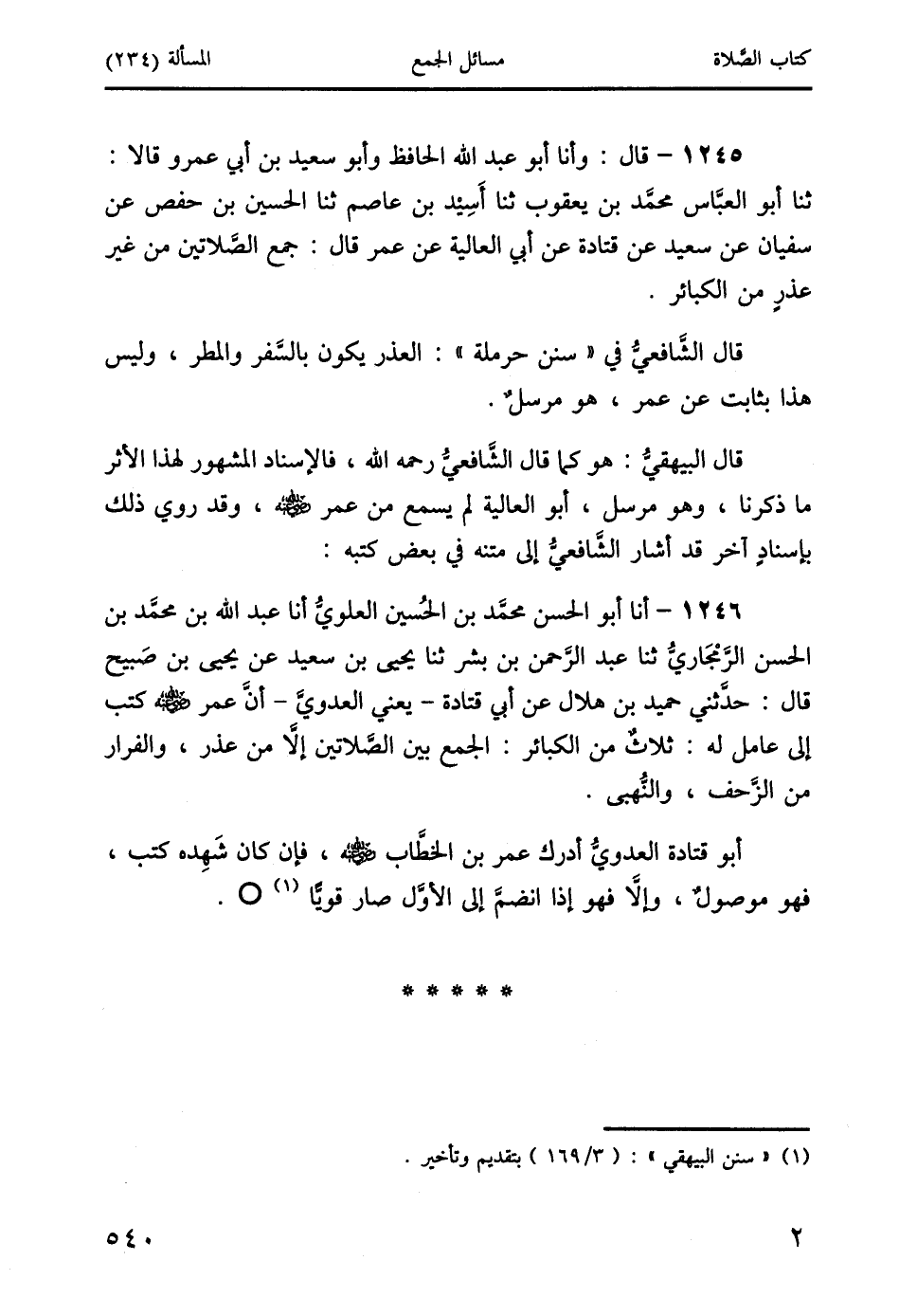 1245 - قال: وأنا أبو عبد الله الحافظ وأبو سعيد بن أبي عمرو قالا: ثنا أبو العباس محمد بن يعقوب ثنا أَسِيد بن عاصم ثنا الحسين بن حفص عن سفيان عن سعيد عن قتادة عن أبي العالية عن عمر قال: جمع الصَّلاتين من غير عذرٍ من الكبائر.