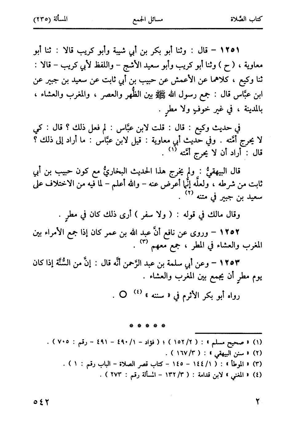 1252 - وروى عن نافع أنَّ عبد الله بن عمر كان إذا جمع الأمراء بين المغرب والعشاء في المطر، جمع معهم (3).