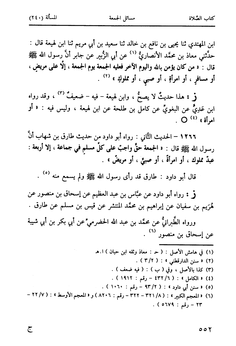 ابن المهتدي ثنا يحيى بن نافع بن خالد ثنا سعيد بن أبي مريم ثنا ابن لهيعة قال: حدَّثني معاذ بن محمد الأنصاريُّ (1) عن أبي الزُّبير عن جابر أنَّ رسول الله صَلَّى اللَّهُ عَلَيْهِ وَسَلَّمَ قال: " من كان يؤمن بالله واليوم الآخر فعليه الجمعة يوم الجمعة، إلا على مريضٍ، أو مسافرٍ، أو امرأةٍ، أو صبيٍّ، أو مملوكٍ " (2).