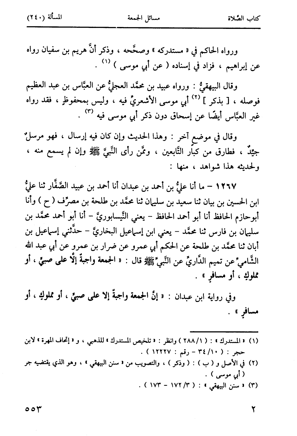 وفي رواية ابن عبدان: " إنَّ الجمعة واجبةٌ إلا على صبيٍّ، أو مملوكٍ، أو مسافرٍ ".