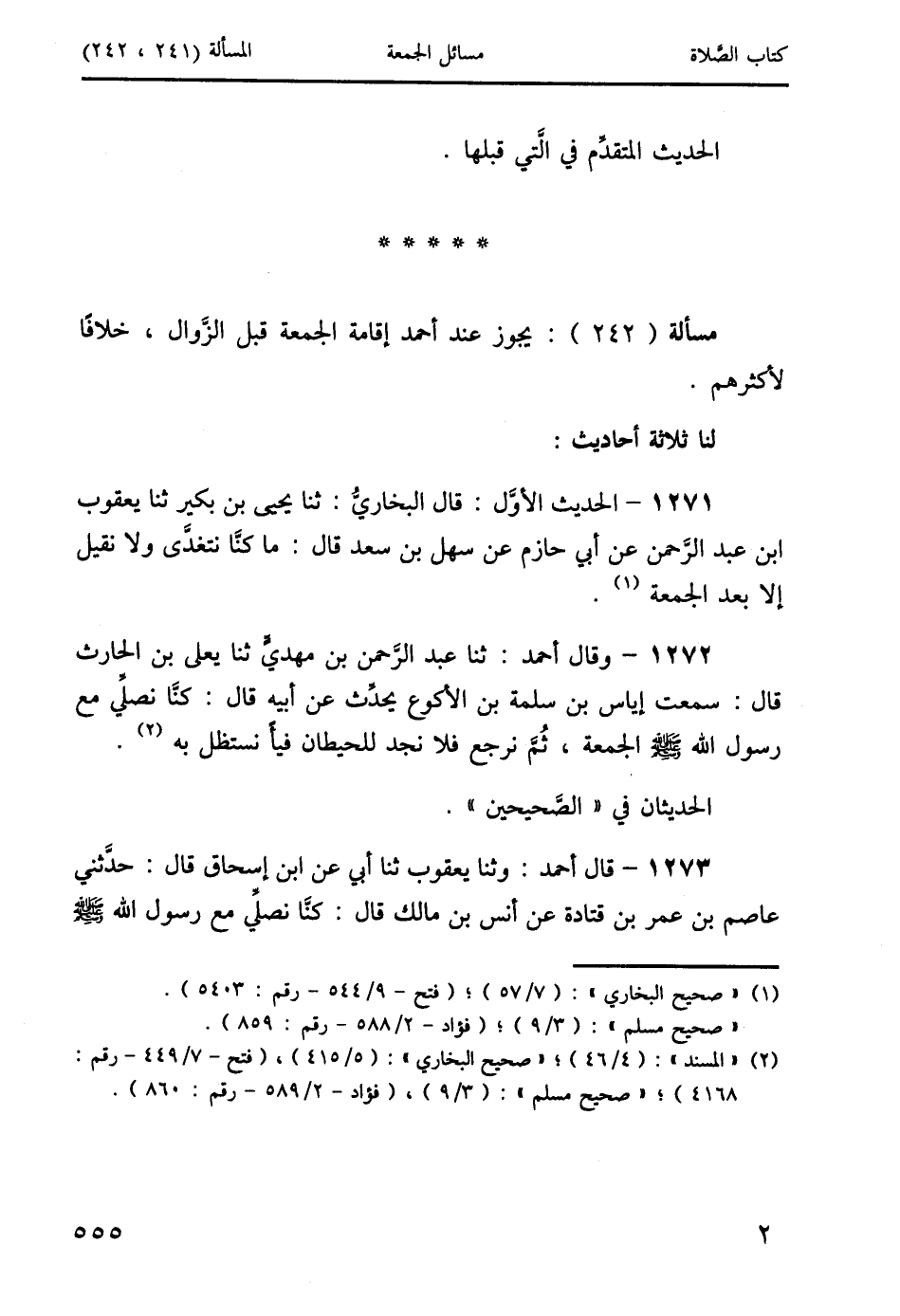 مسألة (242): يجوز عند أحمد إقامة الجمعة قبل الزَّوال، خلافًا لأكثرهم.