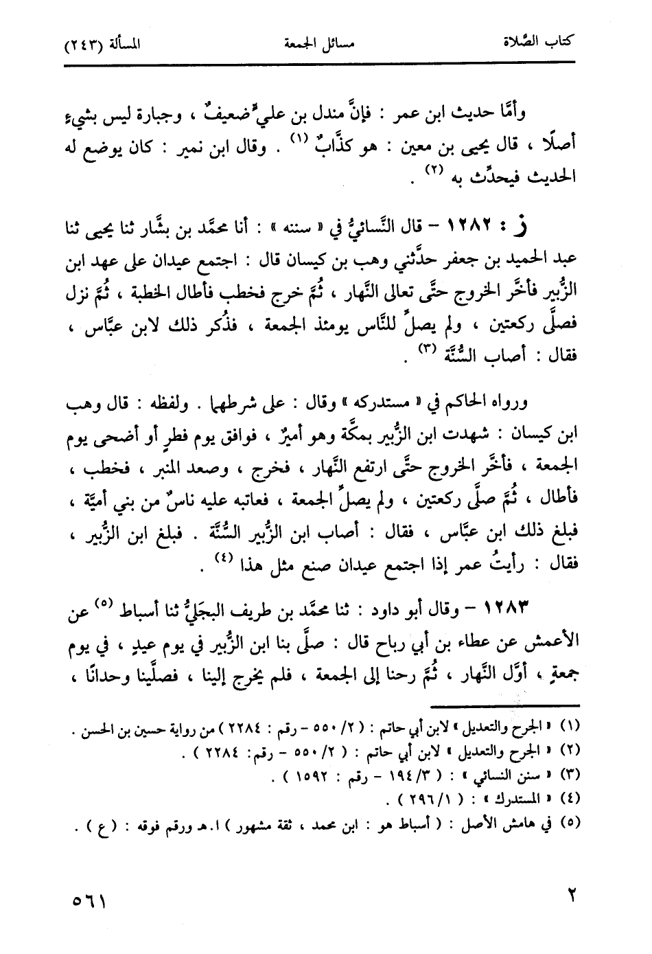 1283 - وقال أبو داود: ثنا محمد بن طريف البجَليُّ ثنا أسباط (5) عن الأعمش عن عطاء بن أبي رباح قال: صلَّى بنا ابن الزُّبير في يوم عيدٍ، في يوم جمعةٍ، أوَّل النَّهار، ثُمَّ رحنا إلى الجمعة، فلم يخرج إلينا، فصلَّينا وحدانًا،