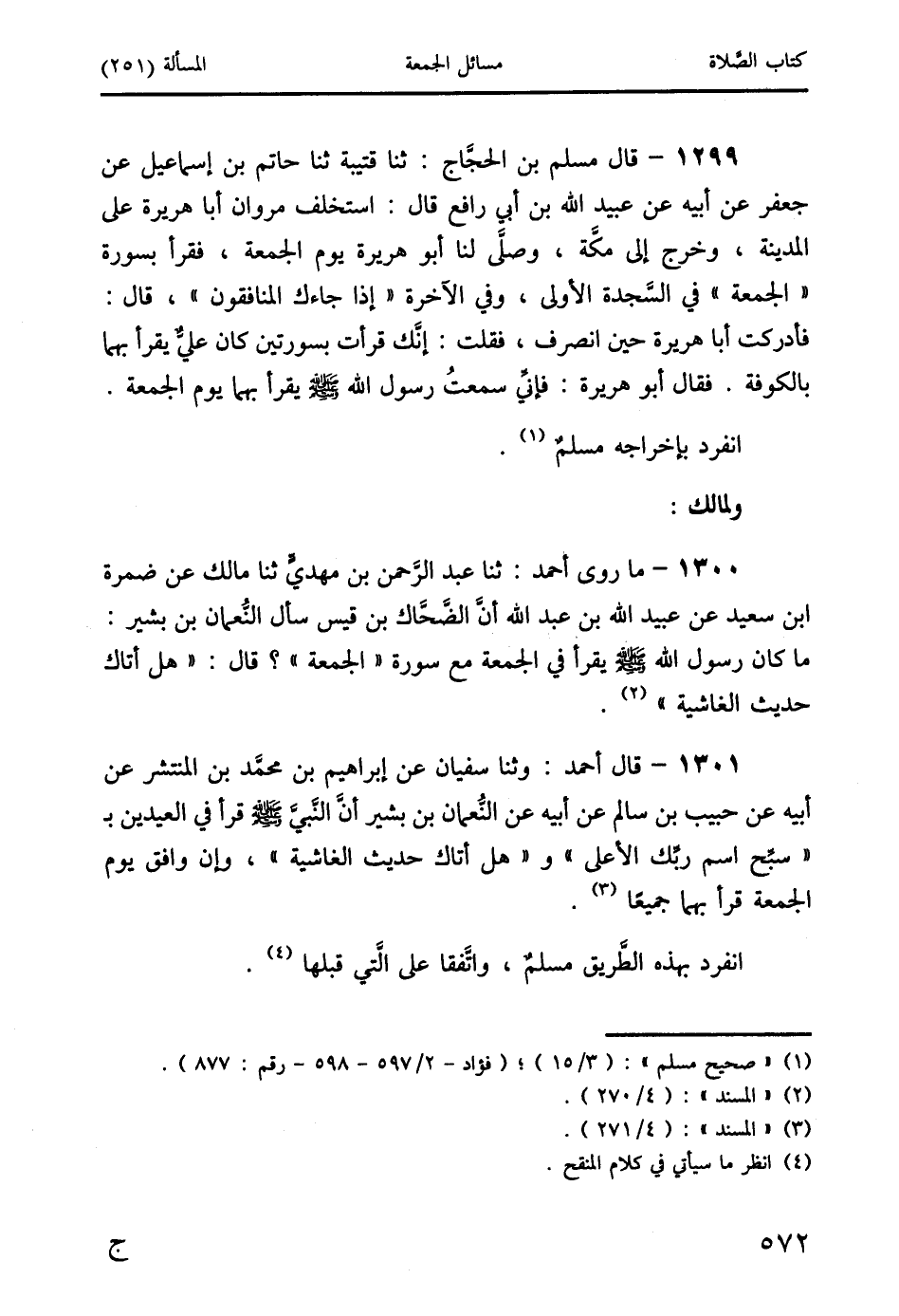 1300 - ما روى أحمد: ثنا عبد الرَّحمن بن مهديٍّ ثنا مالك عن ضمرة ابن سعيد عن عبيد الله بن عبد الله أنَّ الضَّحَّاك بن قيس سأل النُّعمان بن بشير: ما كان رسول الله صَلَّى اللَّهُ عَلَيْهِ وَسَلَّمَ يقرأ في الجمعة مع سورة " الجمعة "؟ قال: " هل أتاك حديث الغاشية " (2).