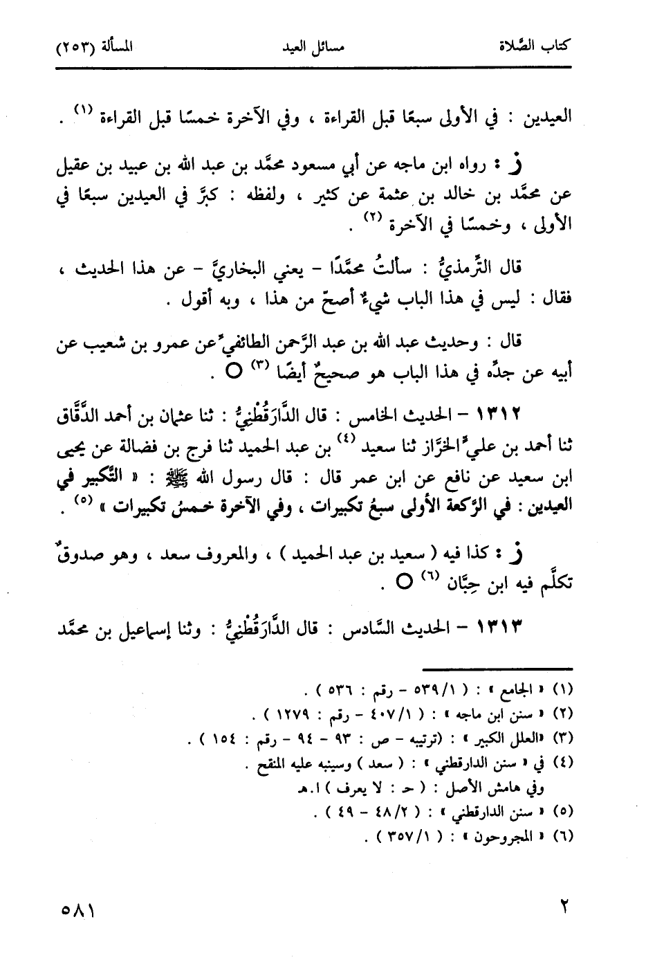 1312 - الحديث الخامس: قال الدَّارَقُطْنِيُّ: ثنا عثمان بن أحمد الدَّقَّاق ثنا أحمد بن عليٍّ الخرَّاز ثنا سعيد (4) بن عبد الحميد ثنا فرج بن فضالة عن يحيى ابن سعيد عن نافع عن ابن عمر قال: قال رسول الله صَلَّى اللَّهُ عَلَيْهِ وَسَلَّمَ: " التَّكبير في العيدين: في الرَّكعة الأولى سبعُ تكبيرات، وفي الآخرة خمسُ تكبيرات " (5).