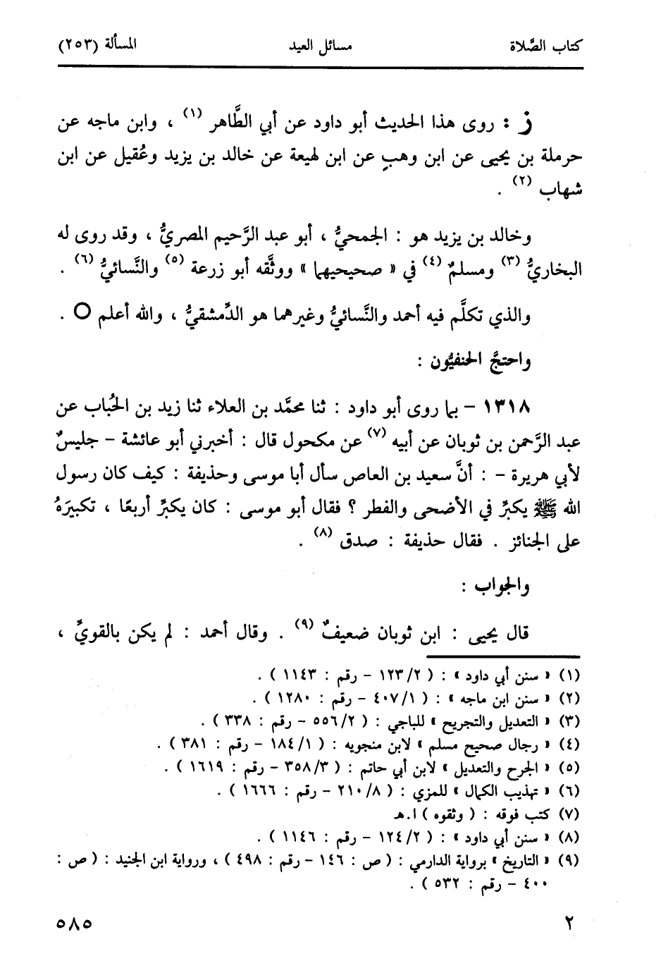 1318 - بما روى أبو داود: ثنا محمد بن العلاء ثنا زيد بن الحُباب عن عبد الرَّحمن بن ثوبان عن أبيه (7) عن مكحول قال: أخبرني أبو عائشة - جليسٌ لأبي هريرة -: أنَّ سعيد بن العاص سأل أبا موسى وحذيفة: كيف كان رسول الله صَلَّى اللَّهُ عَلَيْهِ وَسَلَّمَ يكبِّر في الأضحى والفطر؟ فقال أبو موسى: كان يكبِّر أربعًا، تكبيرَهُ على الجنائز. فقال حذيفة: صدق (8).