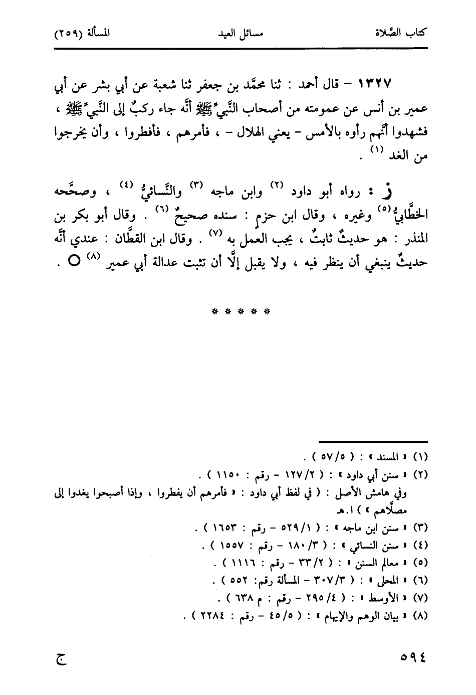 1327 - قال أحمد: ثنا محمد بن جعفر ثنا شعبة عن أبي بشر عن أبي عمير بن أنس عن عمومته من أصحاب النَّبيِّ صَلَّى اللَّهُ عَلَيْهِ وَسَلَّمَ أنَّه جاء ركبٌ إلى النَّبيِّ صَلَّى اللَّهُ عَلَيْهِ وَسَلَّمَ، فشهدوا أنَّهم رأوه بالأمس - يعني الهلال -، فأمرهم، فأفطروا، وأن يخرجوا من الغد (1).
