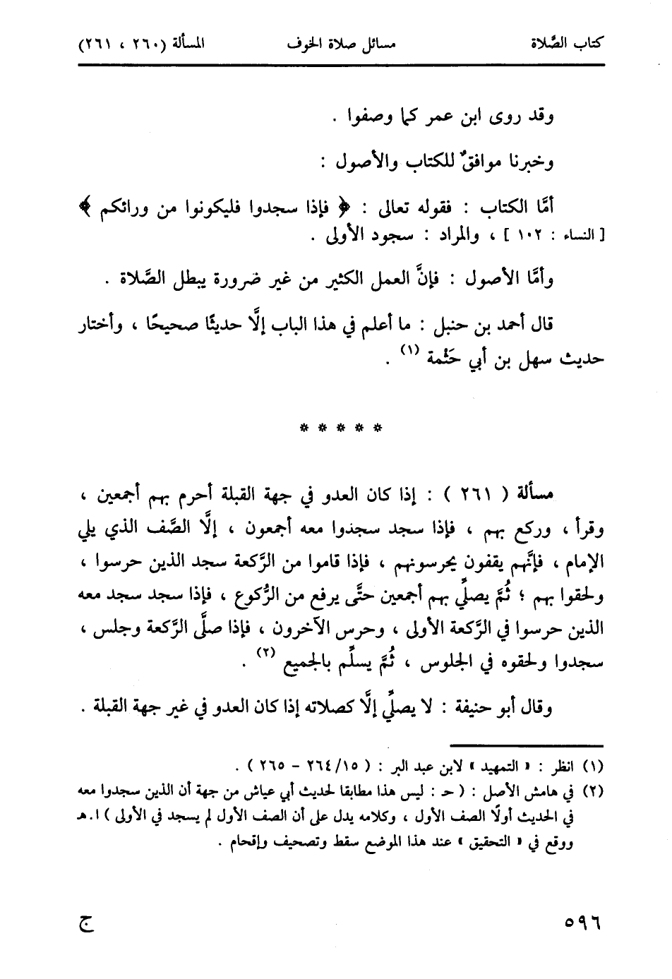 مسألة (261): إذا كان العدو في جهة القبلة أحرم بهم أجمعين، وقرأ، وركع بهم، فإذا سجد سجدوا معه أجمعون، إلا الصَّف الذي يلي الإمام، فإنَّهم يقفون يحرسونهم، فإذا قاموا من الرَّكعة سجد الذين حرسوا، ولحقوا بهم؛ ثُمَّ يصلِّي بهم أجمعين حتى يرفع من الرُّكوع، فإذا سجد سجد معه الذين حرسوا في الرَّكعة الأولى، وحرس الآخرون، فإذا صلَّى الرَّكعة وجلس، سجدوا ولحقوه في الجلوس، ثُمَّ يسلم بالجميع (2).
