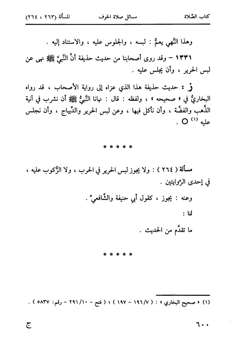 مسألة (264): ولا يجوز لبس الحرير في الحرب، ولا الرُّكوب عليه، في إحدى الرِّوايتين.