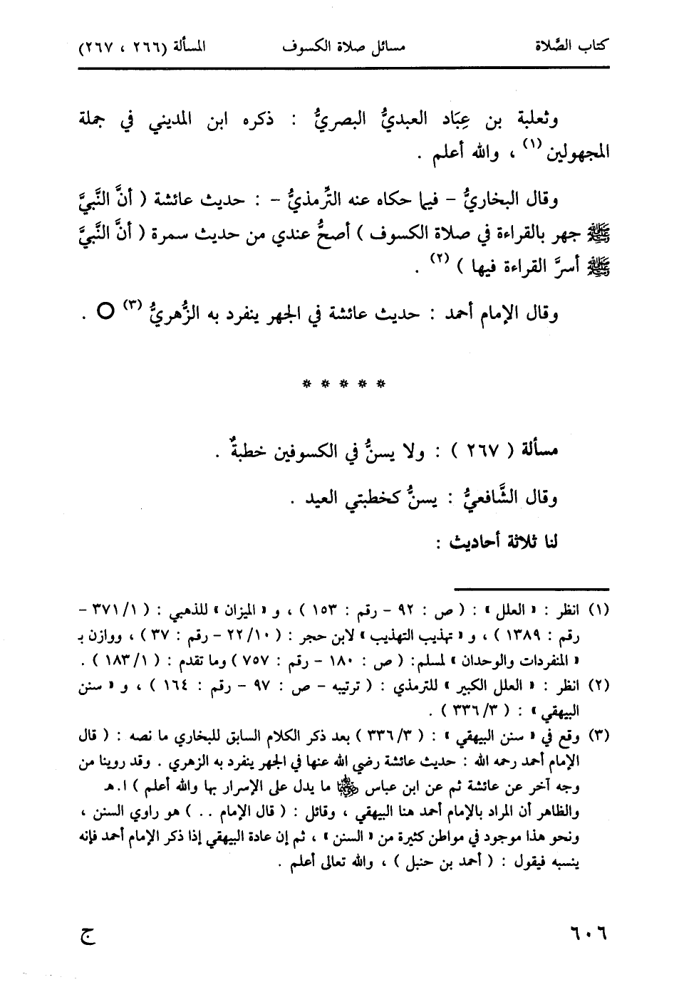 وقال البخاريُّ - فيما حكاه عنه التِّرمذيُّ -: حديث عائشة (أنَّ النَّبيَّ صَلَّى اللَّهُ عَلَيْهِ وَسَلَّمَ جهر بالقراءة في صلاة الكسوف) أصحُّ عندي من حديث سمرة (أنَّ النَّبيَّ صَلَّى اللَّهُ عَلَيْهِ وَسَلَّمَ أسرَّ القراءة فيها) (2).