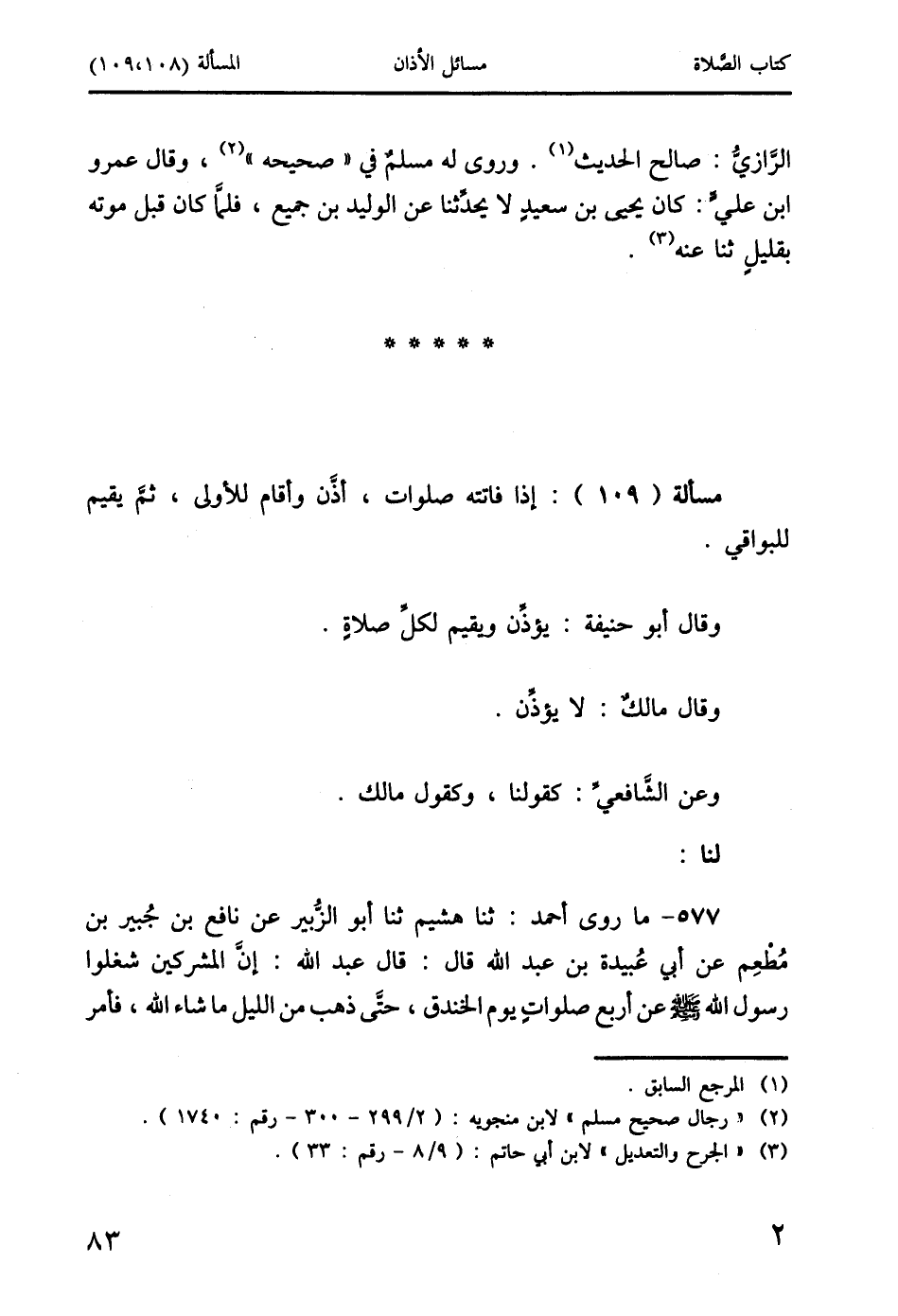 577 - ما روى أحمد: ثنا هشيم ثنا أبو الزُّبير عن نافع بن جُبير بن مُطْعِم عن أبي عُبيدة بن عبد الله قال: قال عبد الله: إنَّ المشركين شغلوا رسول الله صَلَّى اللَّهُ عَلَيْهِ وَسَلَّمَ عن أربع صلواتٍ يوم الخندق، حتى ذهب من الليل ما شاء الله، فأمر