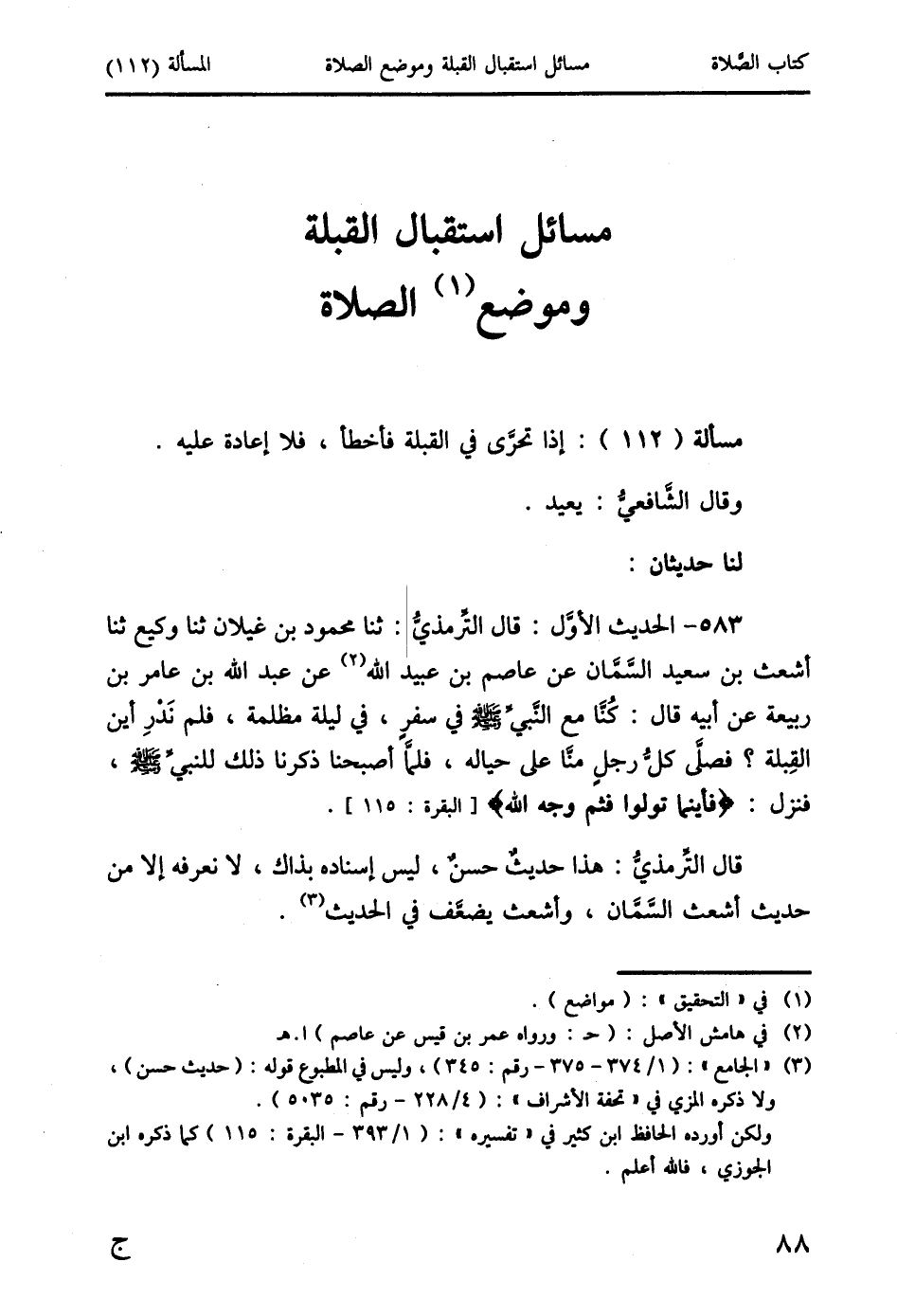 583 - الحديث الأوَّل: قال التِّرمذيُّ: ثنا محمود بن غيلان ثنا وكيع ثنا أشعث بن سعيد السَّمَّان عن عاصم بن عبيد الله (2) عن عبد الله بن عامر بن ربيعة عن أبيه قال: كُنَّا مع النَّبيِّ صَلَّى اللَّهُ عَلَيْهِ وَسَلَّمَ في سفرٍ، في ليلة مظلمة، فلم نَدْرِ أين القِبلة؟ فصلَّى كلُّ رجلٍ منَّا على حياله، فلما أصبحنا ذكرنا ذلك للنَّبيِّ صَلَّى اللَّهُ عَلَيْهِ وَسَلَّمَ، فنزل {فَأَيْنَمَا تُوَلُّوا فَثَمَّ وَجْهُ اللَّهِ} [البقرة: 115].