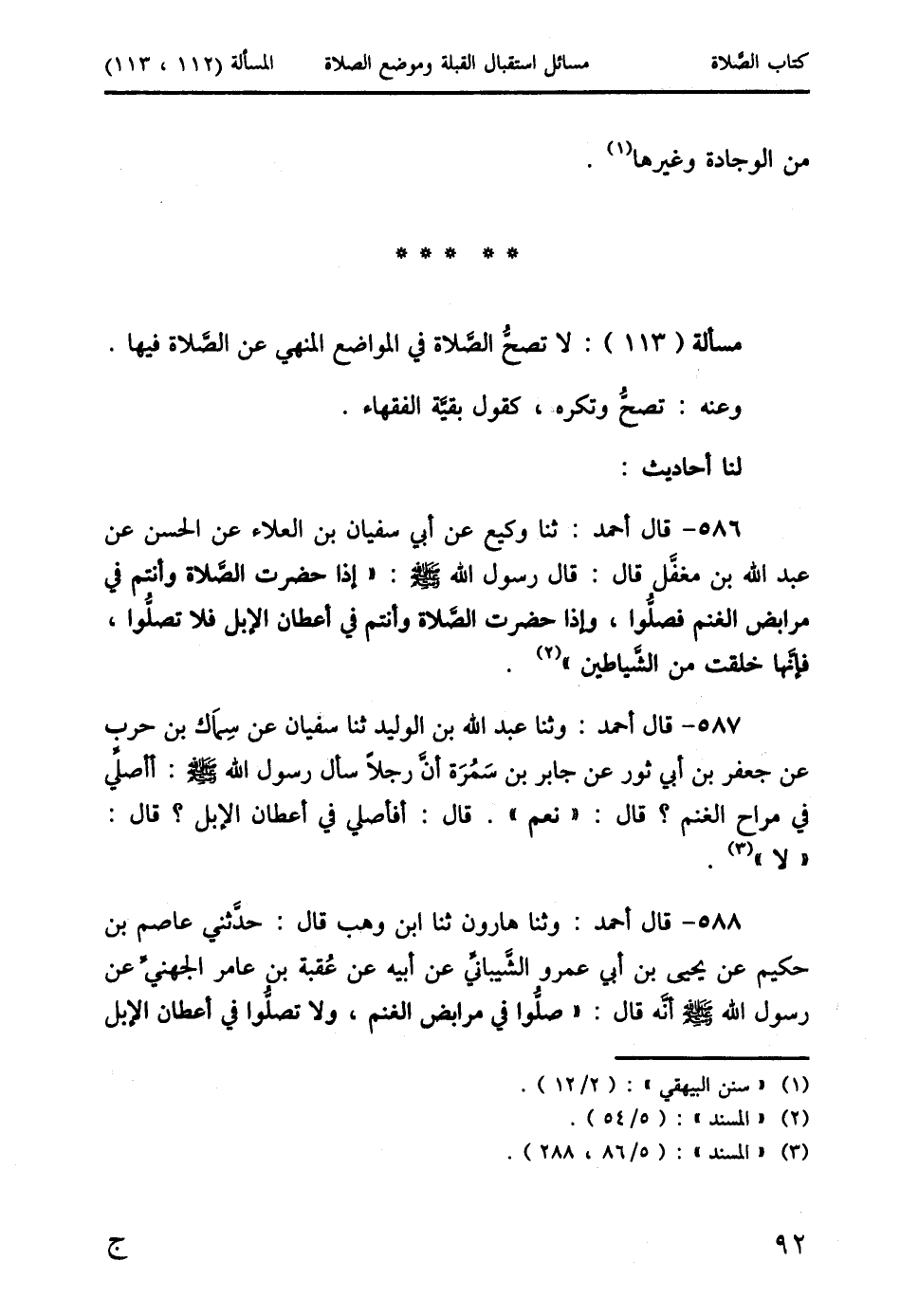 587 - قال أحمد: وثنا عبد الله بن الوليد ثنا سفيان عن سِماَك بن حرب عن جعفر بن أبي ثور عن جابر بن سَمُرَة أنَّ رجلاً سأل رسول الله صَلَّى اللَّهُ عَلَيْهِ وَسَلَّمَ: أأصلِّي في مراح الغنم؟ قال: " نعم ". قال: أفأصلِّي في أعطان الإبل؟ قال: " لا " (3).