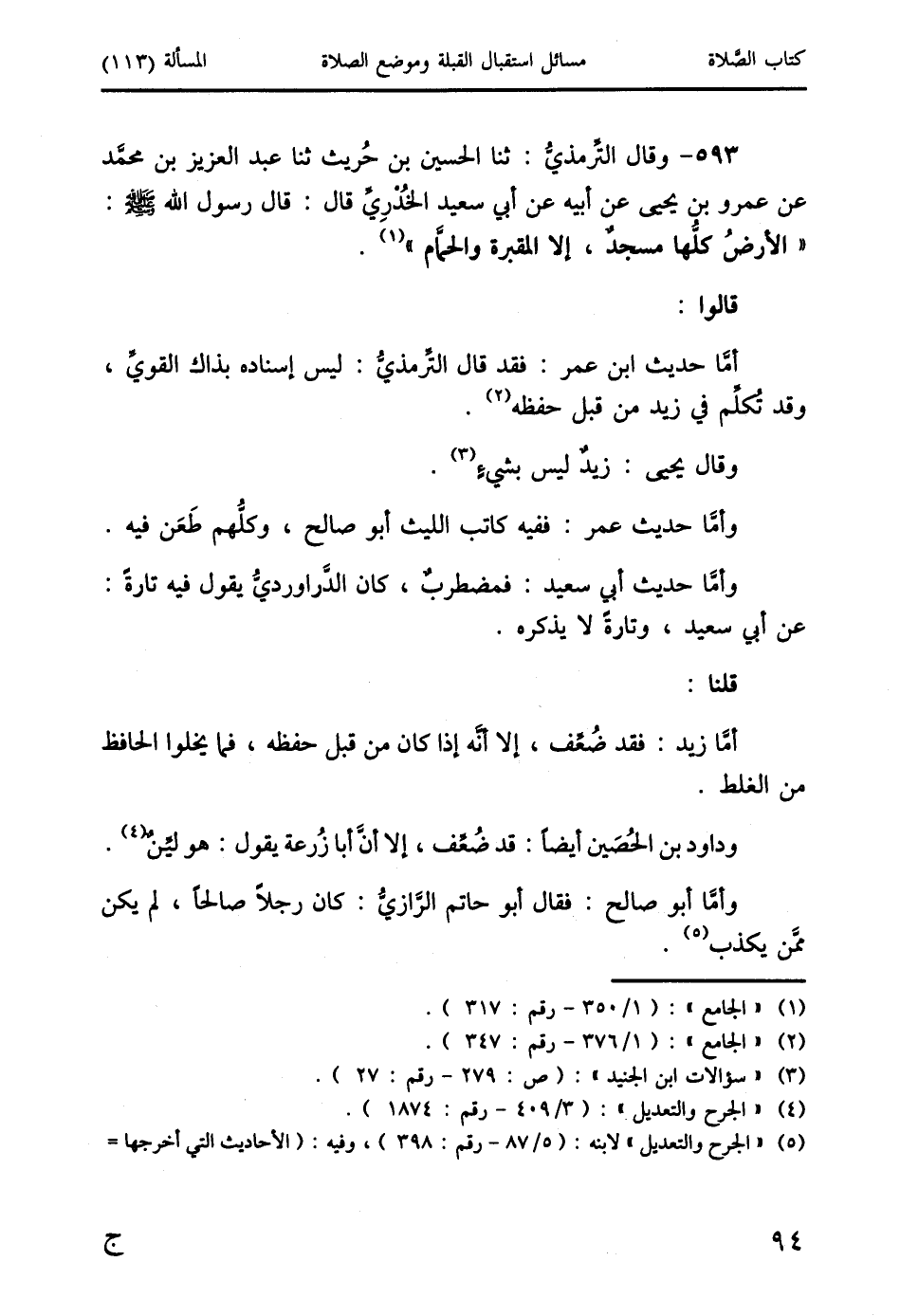 593 - وقال التِّرمذيُّ: ثنا الحسين بن حُريث ثنا عبد العزيز بن محمد عن عمرو بن يحيى عن أبيه عن أبي سعيد الخُدْرِيِّ قال: قال رسول الله صَلَّى اللَّهُ عَلَيْهِ وَسَلَّمَ: " الأرضُ كلُّها مسجدٌ، إلا المقبرة والحمَّام " (1).