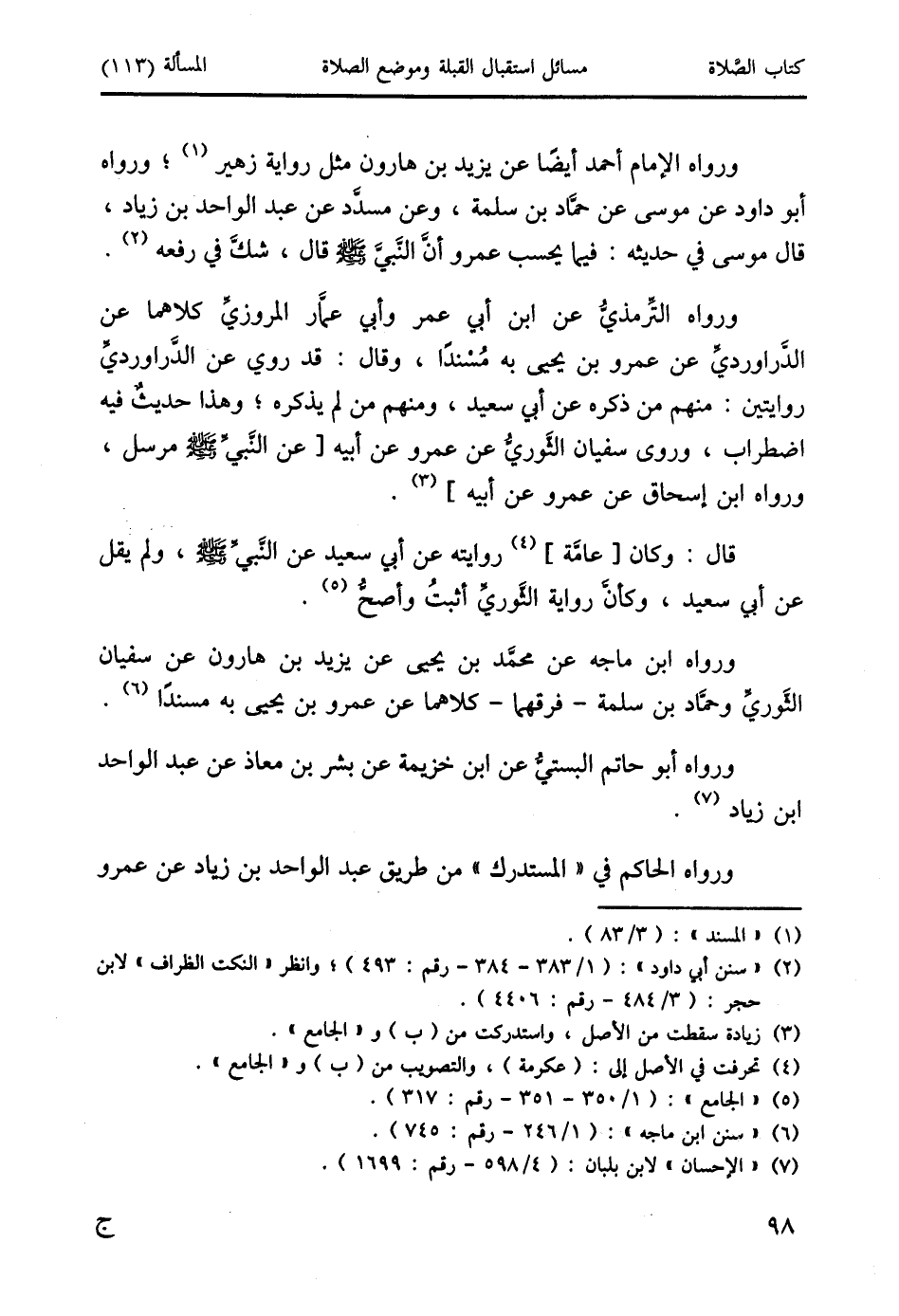 ورواه الإمام أحمد أيضًا عن يزيد بن هارون مثل رواية زهير (1)؛ ورواه أبو داود عن موسى عن حمَّاد بن سلمة، وعن مسدَّد عن عبد الواحد بن زياد، قال موسى في حديثه: فيما يحسب عمرو أنَّ النَّبيَّ صَلَّى اللَّهُ عَلَيْهِ وَسَلَّمَ قال، شكَّ في رفعه (2).