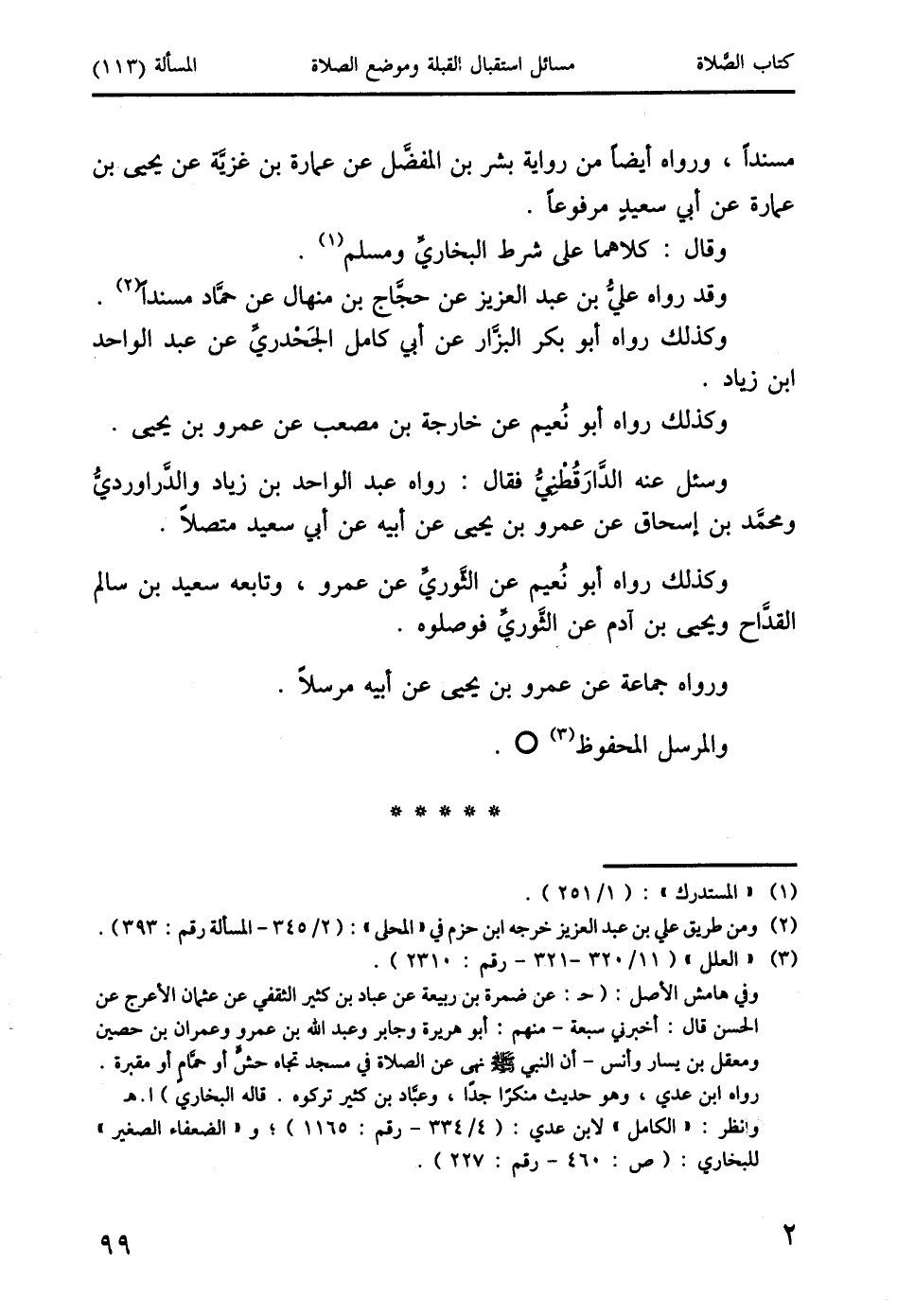 وسئل عنه الدَّارَقُطْنِيُّ فقال: رواه عبد الواحد بن زياد والدَّراورديُّ ومحمد بن إسحاق عن عمرو بن يحيى عن أبيه عن أبي سعيد متصلاً.
