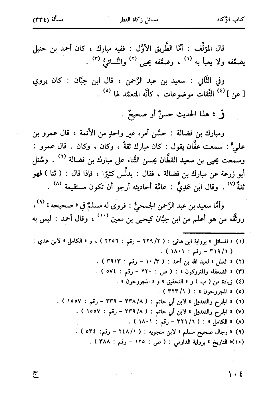 قال المؤلِّف: أمَّا الطَّريق الأوَّل: ففيه مبارك، كان أحمد بن حنبل يضعِّفه ولا يعبأ به (1)، وضعَّفه يحيى (2) والنَّسائيُّ (3).
