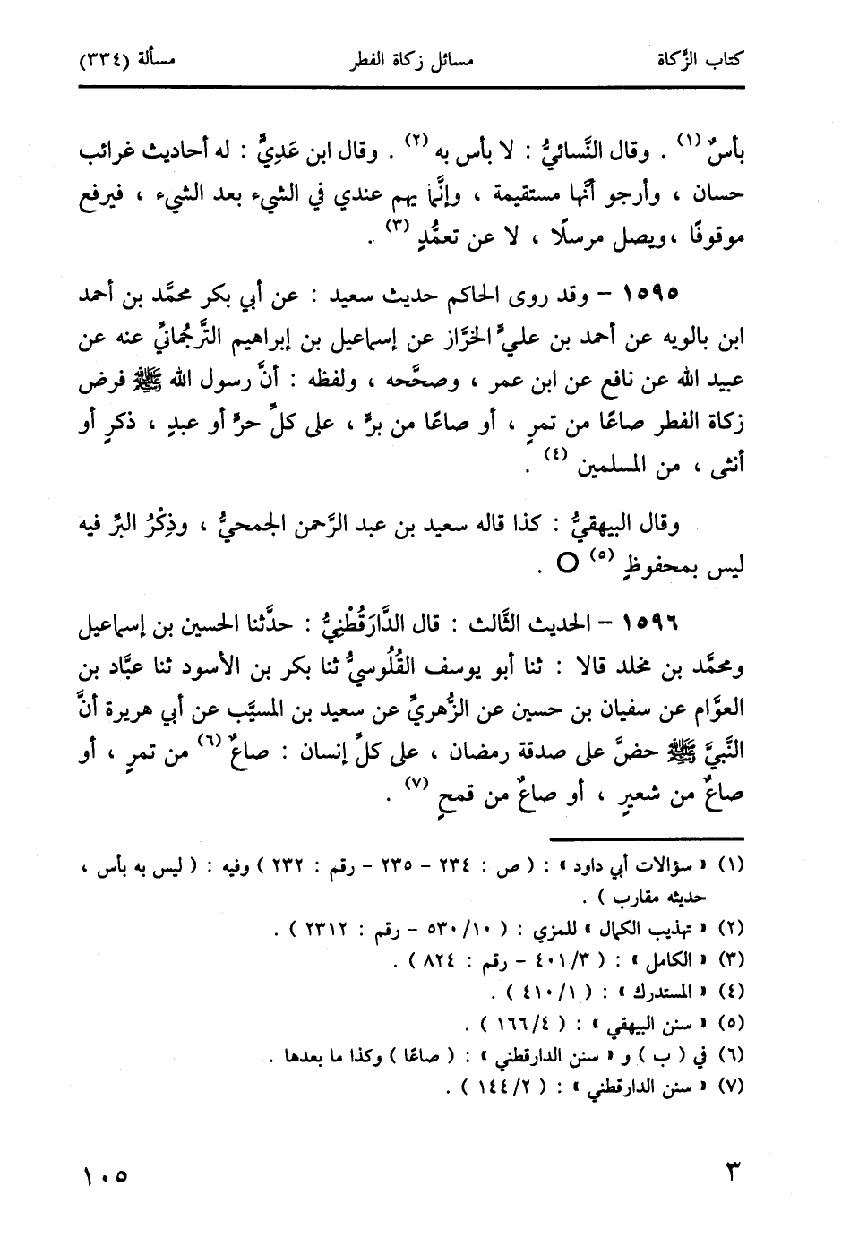1595 - وقد روى الحاكم حديث سعيد: عن أبي بكر محمَّد بن أحمد ابن بالويه عن أحمد بن عليٍّ الخرَّاز عن إسماعيل بن إبراهيم التَّرجُمانيِّ عنه عن عبيد الله عن نافع عن ابن عمر، وصحَّحه، ولفظه: أنَّ رسول الله صَلَّى اللَّهُ عَلَيْهِ وَسَلَّمَ فرض زكاة الفطر صاعًا من تمرٍ، أو صاعًا من برٍّ، على كلِّ حرٍّ أو عبدٍ، ذكرٍ أو أنثى، من المسلمين (4).