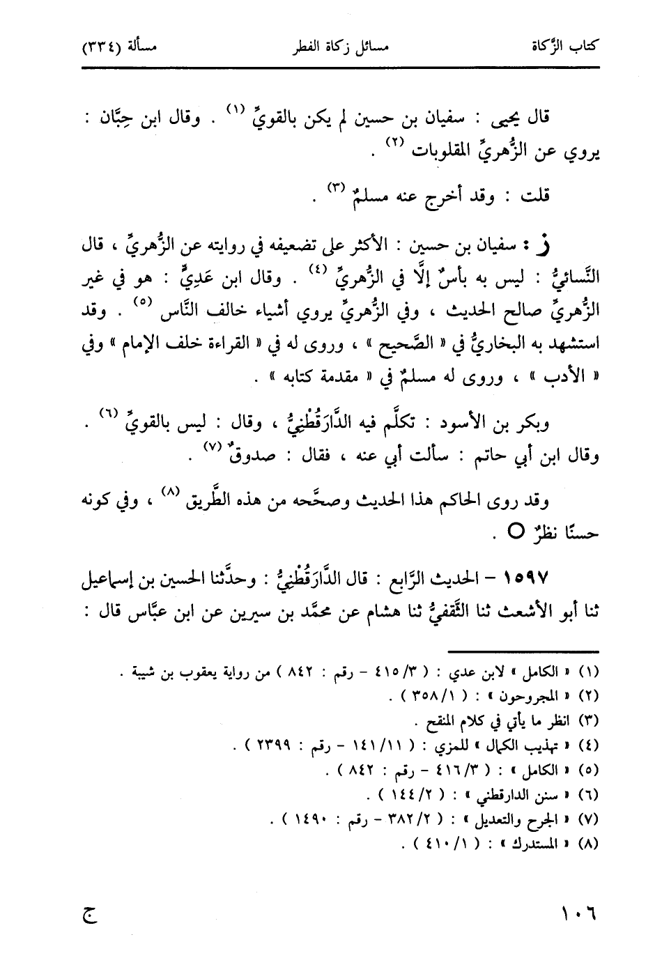 ز: سفيان بن حسين: الأكثر على تضعيفه في روايته عن الزُّهريِّ، قال النَّسائيُّ: ليس به بأسٌ إلا في الزُّهريِّ (4). وقال ابن عَدِيٍّ: هو في غير الزُّهريِّ صالح الحديث، وفي الزُّهريِّ يروي أشياء خالف النَّاس (5). وقد استشهد به البخاريُّ في " الصَحيح "، وروى له في " القراءة خلف الإمام " وفي "الأدب"، وروى له مسلمٌ في " مقدمة كتابه ".