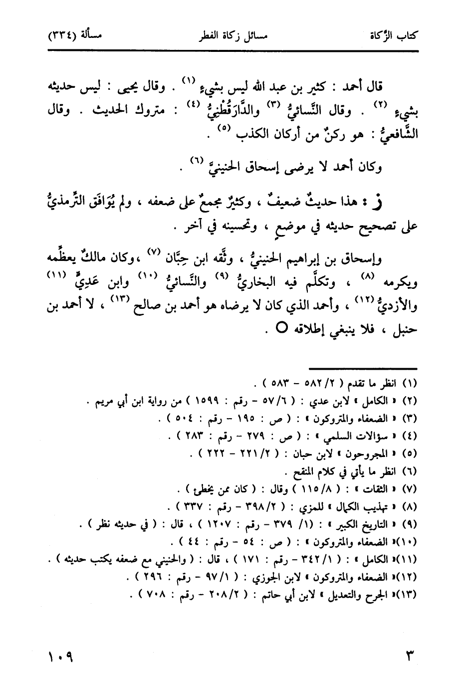قال أحمد: كثير بن عبد الله ليس بشيءٍ (1). وقال يحيى: ليس حديثه بشيءٍ (2). وقال النَّسائيُّ (3) والدَّارَقُطْنِيُّ (4): متروك الحديث. وقال الشَّافعيُّ: هو ركنٌ من أركان الكذب (5).