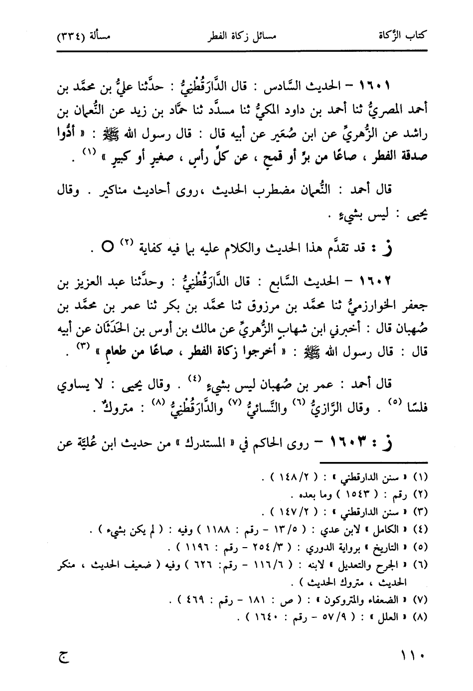 1601 - الحديث السَّادس: قال الدَّارَقُطْنِيُّ: حدَّثنا عليُّ بن محمَّد بن أحمد المصريُّ ثنا أحمد بن داود المكيُّ ثنا مسدَّد ثنا حمَّاد بن زيد عن النُّعمان بن راشد عن الزُّهريِّ عن ابن صُعَير عن أبيه قال: قال رسول الله صَلَّى اللَّهُ عَلَيْهِ وَسَلَّمَ: " أدُّوا صدقة الفطر، صاعًا من برٍّ أو قمحٍ، عن كل رأسٍ، صغيرٍ أو كبيرٍ " (1).
