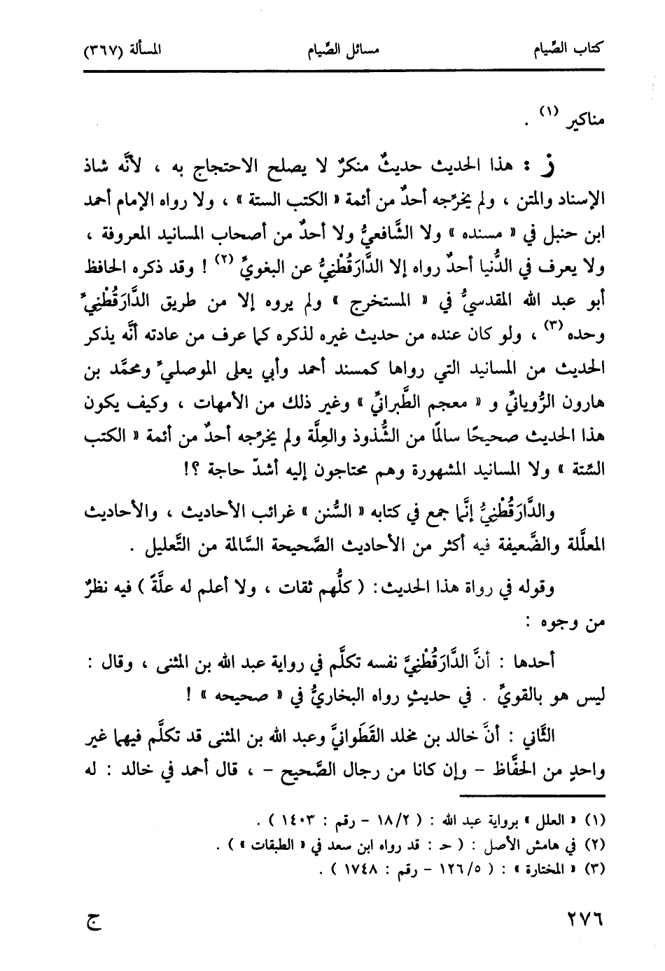 ز: هذا الحديث حديثٌ منكرٌ لا يصلح الاحتجاج به، لأنَّه شاذ الإسناد والمتن، ولم يخرِّجه أحدٌ من أئمة " الكتب الستة "، ولا رواه الإمام أحمد ابن حنبل في "مسنده" ولا الشَّافعيُّ ولا أحدٌ من أصحاب المسانيد المعروفة، ولا يعرف في الدُّنيا أحدٌ رواه إلا الدَّارَقُطْنِيُّ عن البغويِّ (2)! وقد ذكره الحافظ أبو عبد الله المقدسيُّ في "المستخرج" ولم يروه إلا من طريق الدَّارَقُطْنِيِّ وحده (3)، ولو كان عنده من حديث غيره لذكره كما عرف من عادته أنَّه يذكر الحديث من المسانيد التي رواها كمسند أحمد وأبي يعلى الموصليِّ ومحمَّد بن هارون الرُّويانيِّ و" معجم الطَّبرانيِّ " وغير ذلك من الأمهات، وكيف يكون هذا الحديث صحيحًا سالمًا من الشُّذوذ والعِلَّة ولم يخرِّجه أحدٌ من أئمة " الكتب الستة " ولا المسانيد المشهورة وهم محتاجون إليه أشدّ حاجة؟!