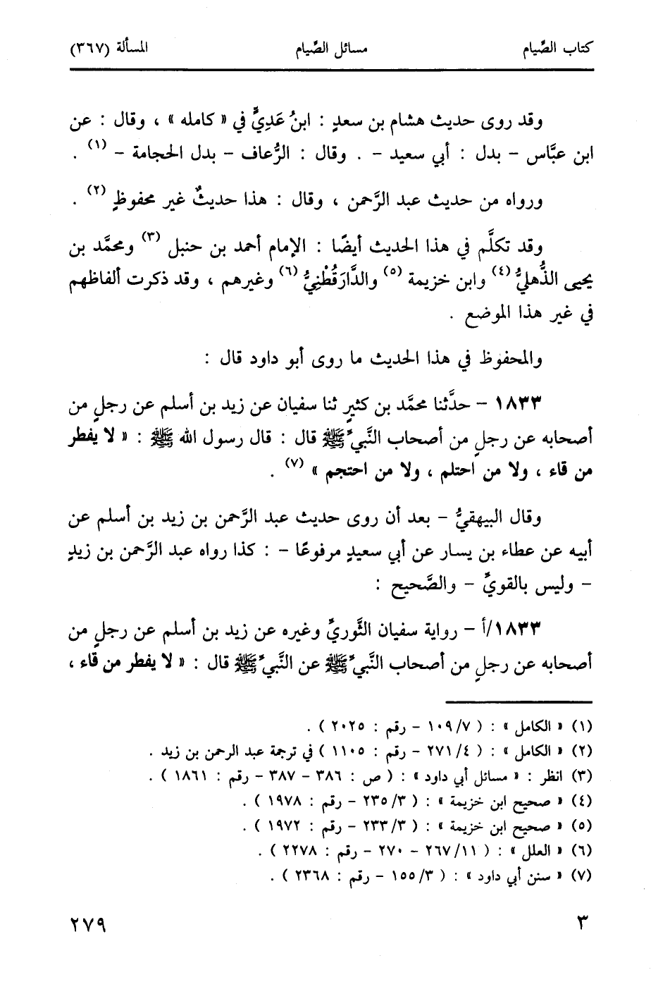 1833/أ- رواية سفيان الثَّوريِّ وغيره عن زيد بن أسلم عن رجلٍ من أصحابه عن رجلٍ من أصحاب النَّبيِّ-صَلَّى اللَّهُ عَلَيْهِ وَسَلَّمَ عن النَّبيِّ صَلَّى اللَّهُ عَلَيْهِ وَسَلَّمَ قال: " لا يفطر من قاء،