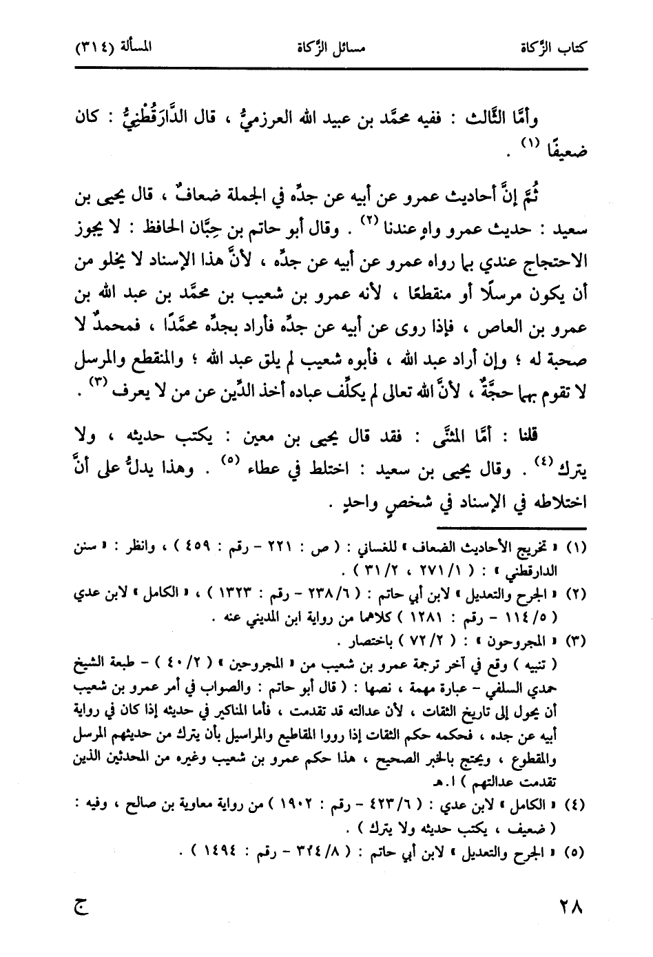 ثُمَّ إنَّ أحاديث عمرو عن أبيه عن جدِّه في الجملة ضعافٌ، قال يحيى بن سعيد: حديث عمرو واهٍ عندنا (2). وقال أبو حاتم بن حِبَّان الحافظ: لا يجوز الاحتجاج عندي بما رواه عمرو عن أبيه عن جدِّه، لأنَّ هذا الإسناد لا يخلو من أن يكون مرسلاً أو منقطعًا، لأنه عمرو بن شعيب بن محمَّد بن عبد الله بن عمرو بن العاص، فإذا روى عن أبيه عن جدِّه فأراد بجدِّه محمَّدًا، فمحمدٌ لا صحبة له؛ وإن أراد عبد الله، فأبوه شعيب لم يلق عبد الله؛ والمنقطع والمرسل لا تقوم بهما حجَّةٌ، لأنَّ الله تعالى لم يكلِّف عباده أخذ الدِّين عن من لا يعرف (3).