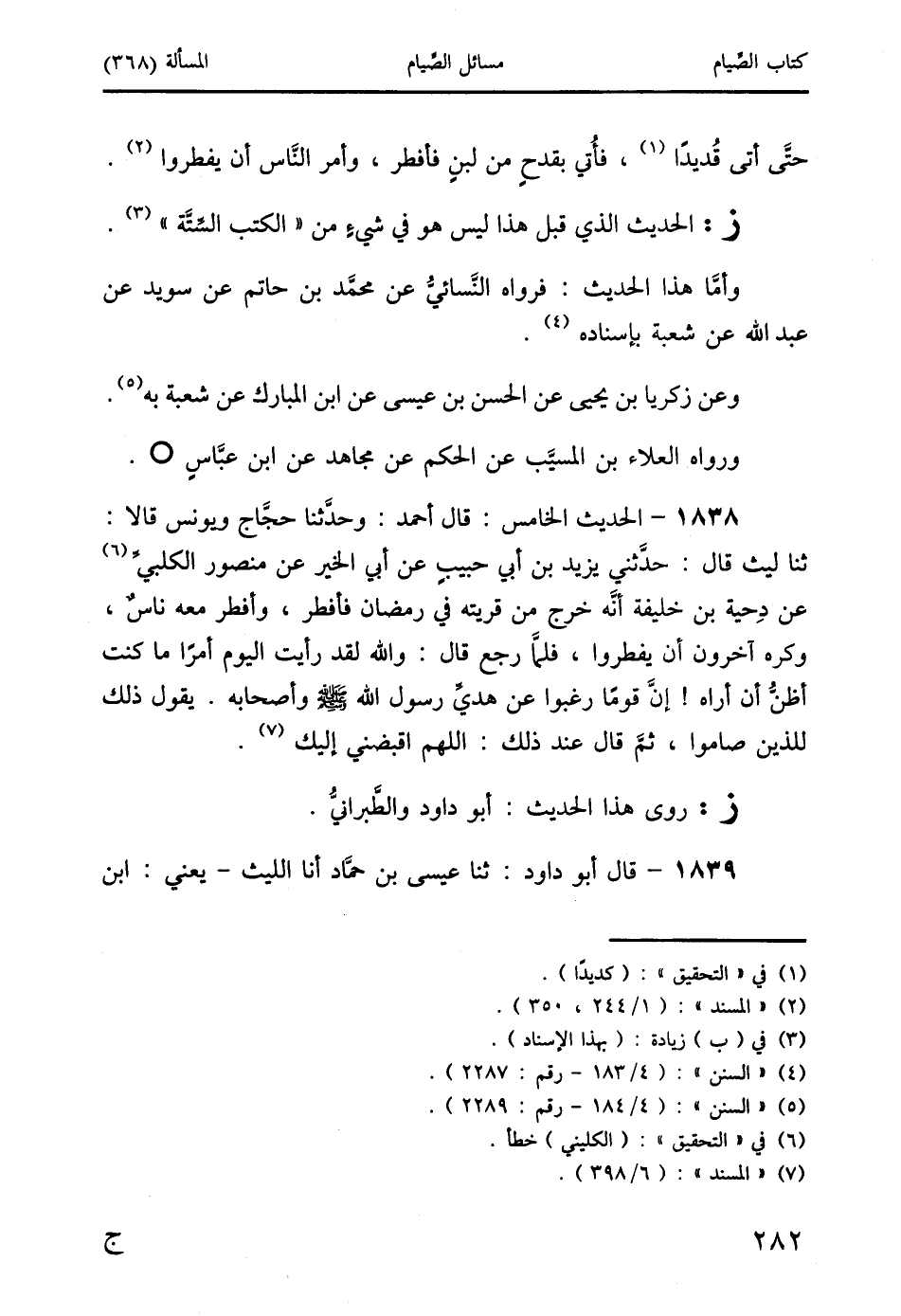 1838 - الحديث الخامس: قال أحمد: وحدَّثنا حجَّاج ويونس قالا: ثنا ليث قال: حدَّثني يزيد بن أبي حبيبٍ عن أبي الخير عن منصور الكلبيِّ (6) عن دِحية بن خليفة أنَّه خرج من قريته في رمضان فأفطر، وأفطر معه ناسٌ، وكره آخرون أن يفطروا، فلمَّا رجع قال: والله لقد رأيت اليوم أمرًا ما كنت أطنُّ أن أراه! إنَّ قومًا رغبوا عن هديِّ رسول الله صَلَّى اللَّهُ عَلَيْهِ وَسَلَّمَ وأصحابه. يقول ذلك للذين صاموا، ثمَّ قال عند ذلك: اللهم اقبضني إليك (7).