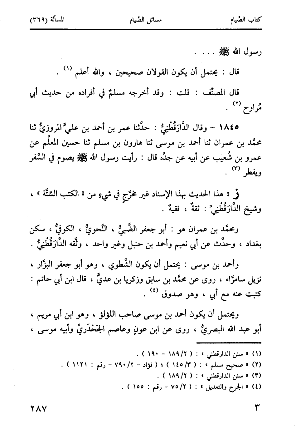 1845 - وقال الدَّارَقُطْنِيُّ: حدَّثنا عمر بن أحمد بن عليٍّ المروزيُّ ثنا محمَّد بن عمران ثنا أحمد بن موسى ثنا هارون بن مسلم ثنا حسين المعلِّم عن عمرو بن شُعيب عن أبيه عن جدِّه قال: رأيت رسول الله-صَلَّى اللَّهُ عَلَيْهِ وَسَلَّمَ يصوم في السَّفر ويفطر (3).