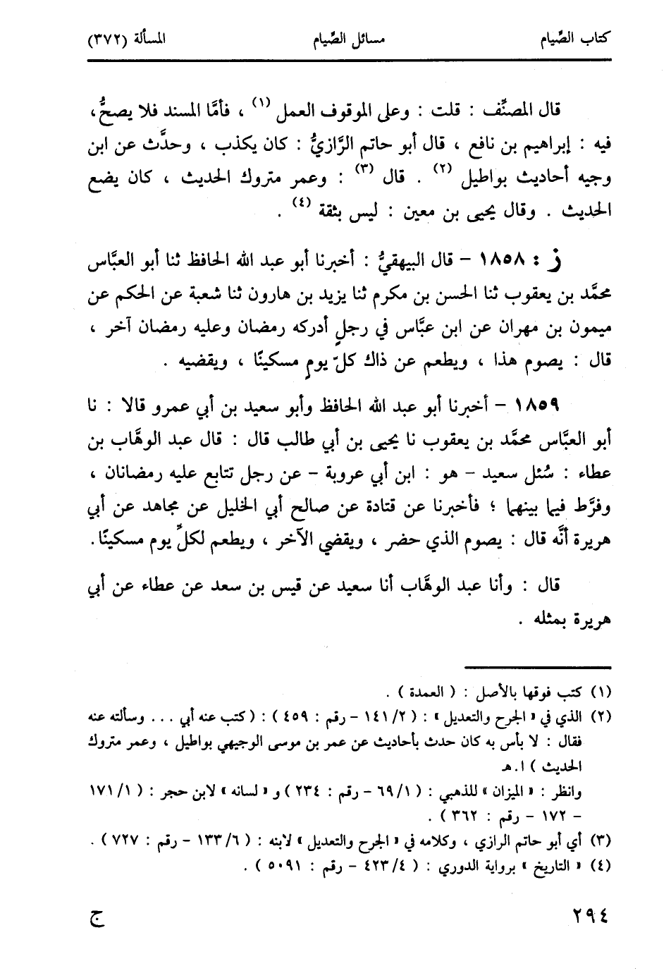 قال المصنِّف: قلت: وعلى الموقوف العمل (1)، فأمَّا المسند فلا يصحُّ، فيه: إبراهيم بن نافع، قال أبو حاتم الرَّازيُّ: كان يكذب، وحدَّث عن ابن وجيه أحاديث بواطيل (2). قال (3): وعمر متروك الحديث، كان يضع الحديث. وقال يحيى بن معين: ليس بثقة (4).