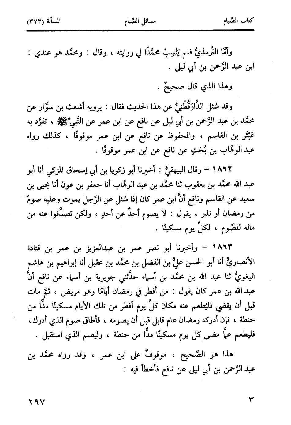 1863 - وأخبرنا أبو نصر عمر بن عبد العزيز بن عمر بن قتادة الأنصاريُّ أنا أبو الحسن عليُّ بن الفضل بن محمَّد بن عقيل أنا إبراهيم بن هاشم البغويُّ ثنا عبد الله بن محمَّد بن أسماء حدَّثني جويرية بن أسماء عن نافع أنَّ عبد الله بن عمر كان يقول: من أفطر في رمضان أيامًا وهو مريض، ثمَّ مات قبل أن يقفيى فليُطعم عنه مكان كلِّ يوم أفطر من تلك الأيام مسكينًا مدًّا من حنطة، فإن أدركه رمضان عام قابل قبل أن يصومه، فأطاق صوم الذي أدرك، فليطعم عمَّا مضى كل يوم مسكينًا مدًّا من حنطة، وليصم الذي استقبل.
