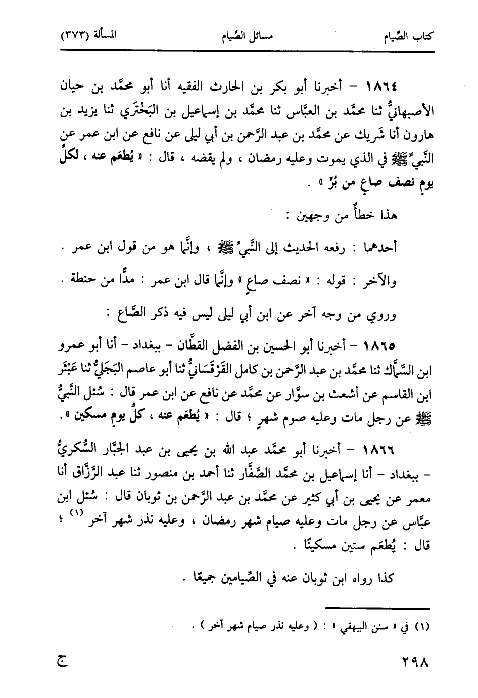 1864 - أخبرنا أبو بكر بن الحارث الفقيه أنا أبو محمَّد بن حيان الأصبهانيُّ ثنا محمَّد بن العبَّاس ثنا محمَّد بن إسماعيل بن البَخْتَري ثنا يزيد بن هارون أنا شَريك عن محمَّد بن عبد الرَّحمن بن أبي ليلى عن نافع عن ابن عمر عن النَّبيِّ صعلم في الذي يموت وعليه رمضان، ولم يقضه، قال: " يُطعَم عنه، لكلِّ يومٍ نصف صاعٍ من بُرٍّ ".