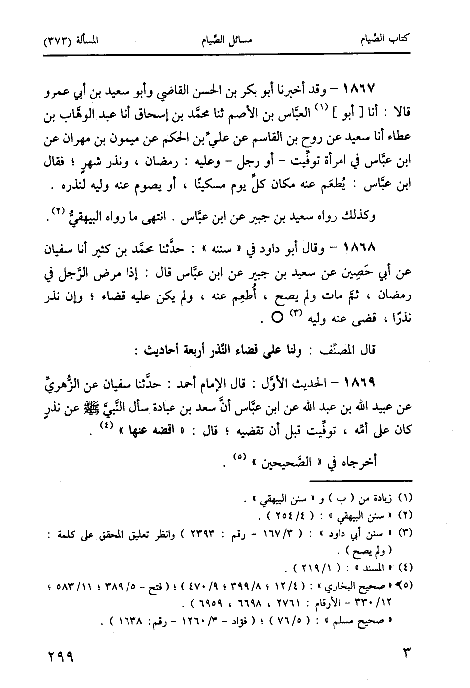 1869 - الحديث الأوَّل: قال الإمام أحمد: حدَّثنا سفيان عن الزُّهريِّ عن عبيد الله بن عبد الله عن ابن عبَّاس أنَّ سعد بن عبادة سأل النَّبيَّ صَلَّى اللَّهُ عَلَيْهِ وَسَلَّمَ عن نذرٍ كان على أمِّه، توفِّيت قبل أن تقضيه؛ قال: " اقضه عنها " (4).
