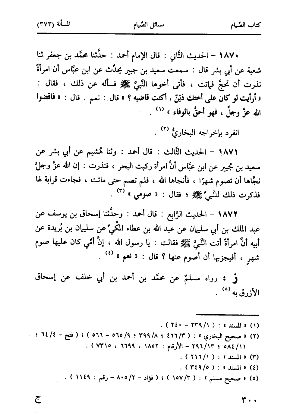 1871 - الحديث الثَّالث: قال أحمد: وثنا هُشيم عن أبي بشر عن سعيد بن جُبير عن ابن عبَّاس أنَّ امرأة ركبت البحر، فنذرت: إن الله عزَّ وجلَّ نجَّاها أن تصوم شهرًا، فأنجاها الله، فلم تصم حتى ماتت، فجاءت قرابة لها فذكرت ذلك للنَّبيِّ يكنً؛ فقال: " صومي " (3).